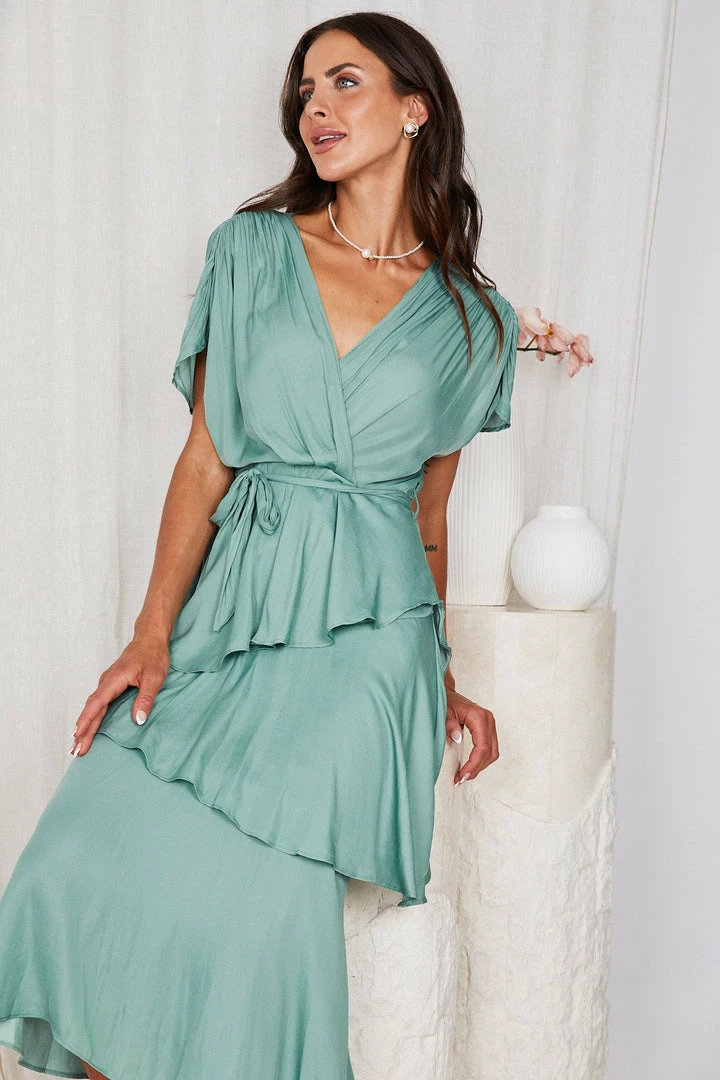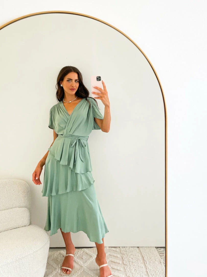 Our Gabbie Dress is a show stopper. This eye-catching midi features a V neckline, petal sleeves, fabric waist tie to cinch in the figure, and a flowy gathered tiered skirt. Pair with your favourite nude strappy heels for a sophisticated look.