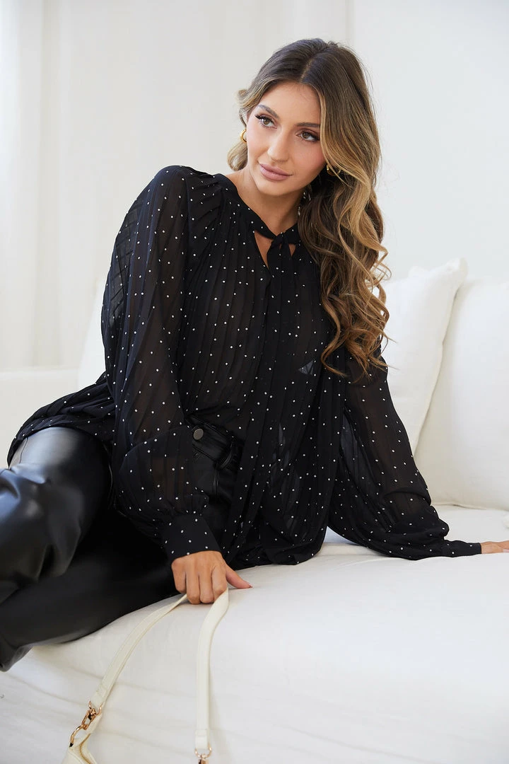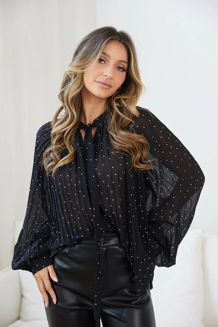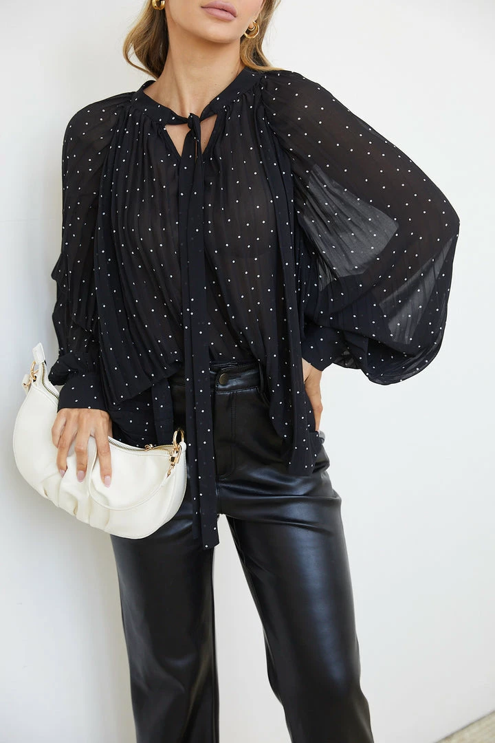 Our Jimesh Blouse comes in a graphite black colour base with white spot prints. An epitome of class and sophistication, this lightweight top features a collar with a self tie bow, long sheer raglan sleeves with cuffs and cute circular patterns all over. Style it with a midi ruched skirt and top off with a dazzling accessory!