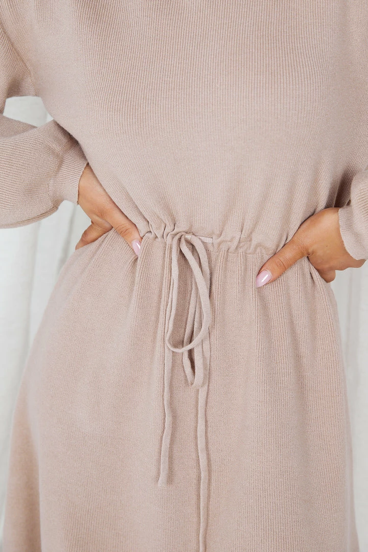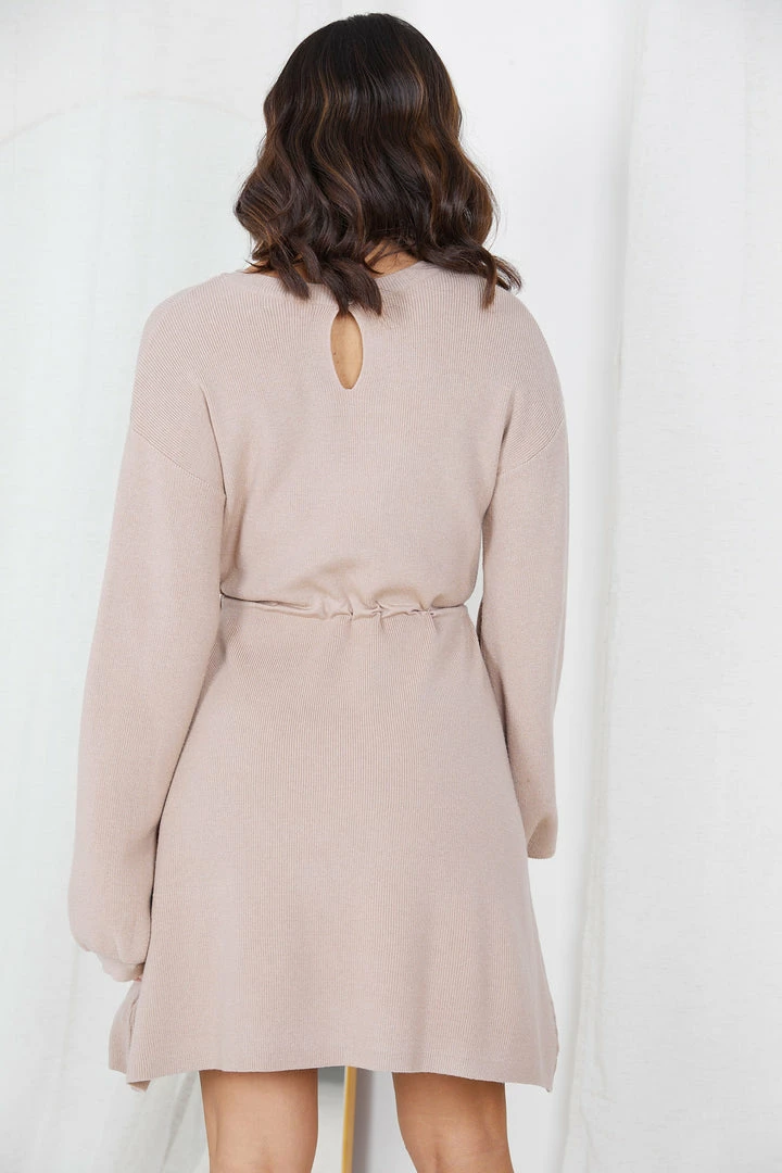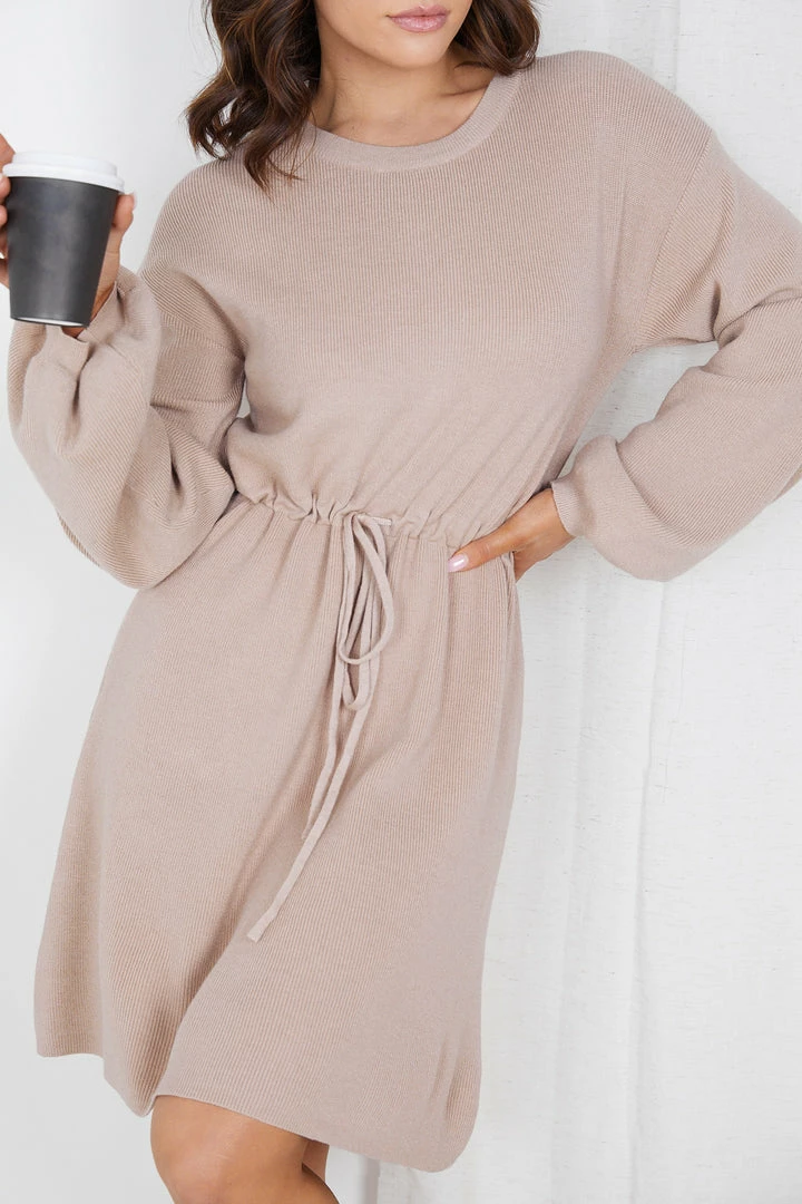 Our Baylee Knit Dress comes in a dark beige colour. A true game changer in the style department, this mini features a round neckline, long drop balloon sleeves, garterized waist with tie and a-line skirt that falls above the knee. Doll up with a beret hat and corset heels!