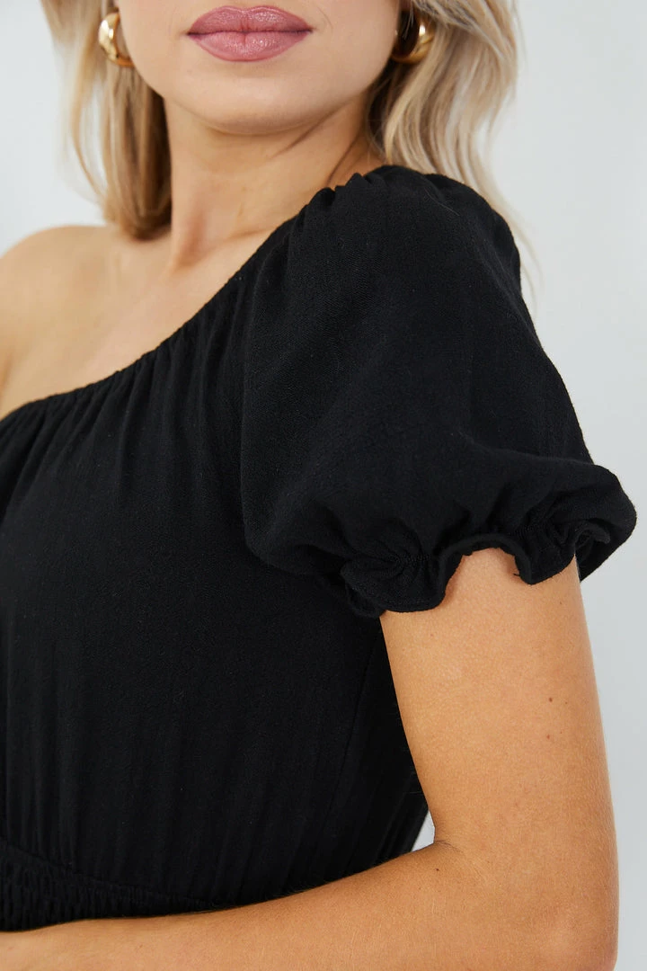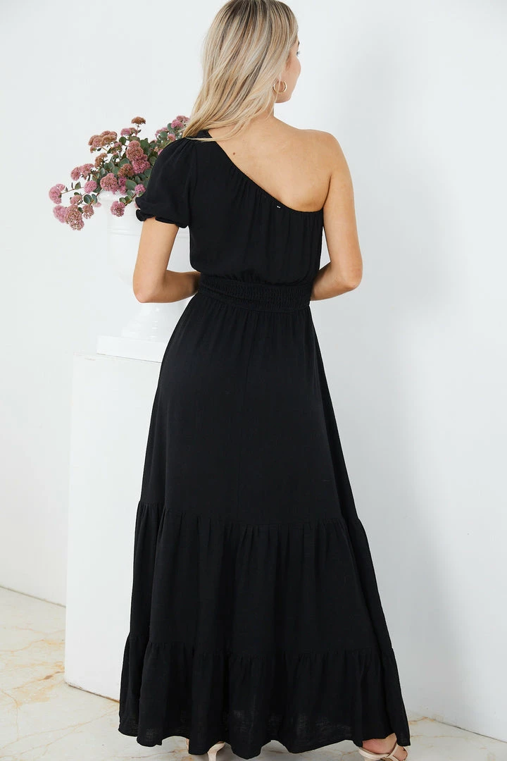 Our Beckas Dress comes in a classic black tone. This maxi features one shoulder with short puff sleeves, an elastic waistband and a flowy tiered skirt! The relaxed fit pairs beautifully with tan sandals and gold accessories.