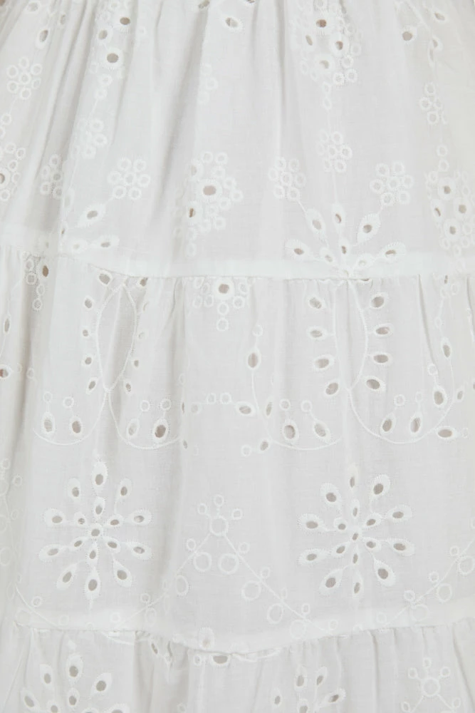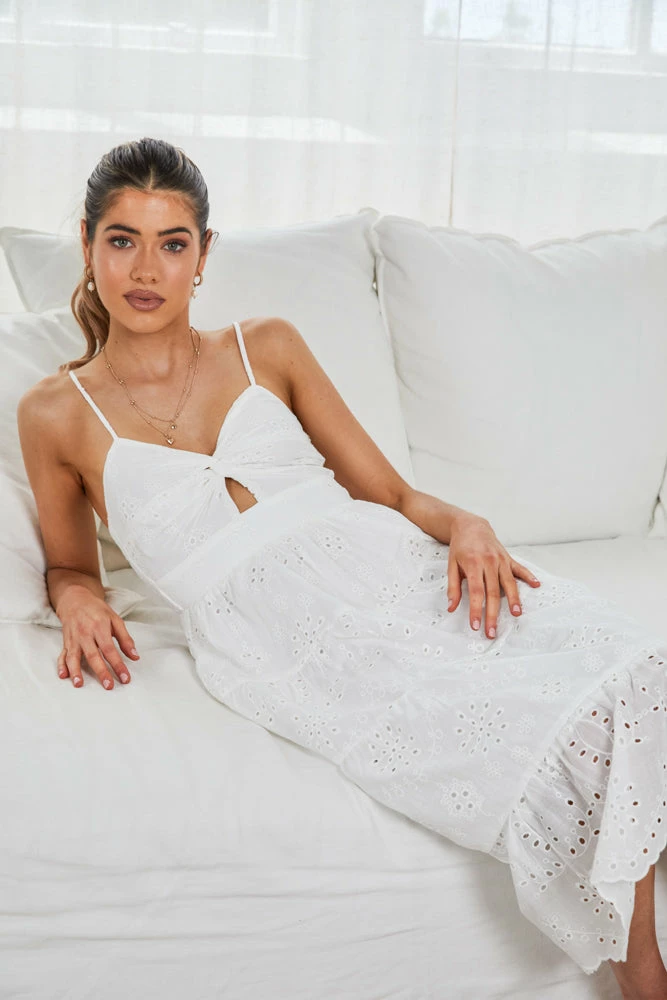Our Chanise Dress comes in a gorgeous white tone. This midi features a butterfly knot style bust, spaghetti straps, and a hanging tiered skirt. This pairs beautifully with sandals and silver accessories for the perfect off-duty look.