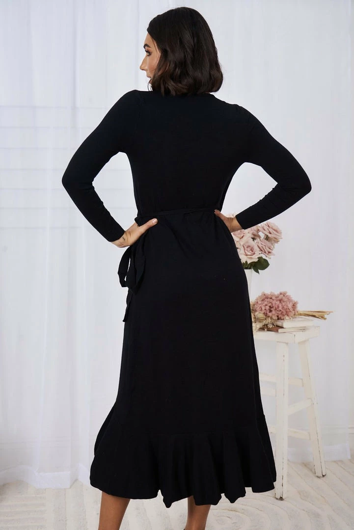 Our Cherice Dress comes in a deep black tone. It features a v neckline and long bishop sleeves for warm, comfortable fit. This wrap-style midi pairs beautifully with heels for an effortless transseasonal look!