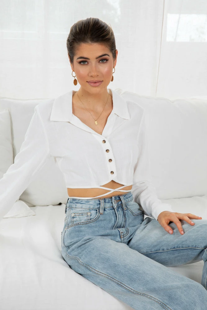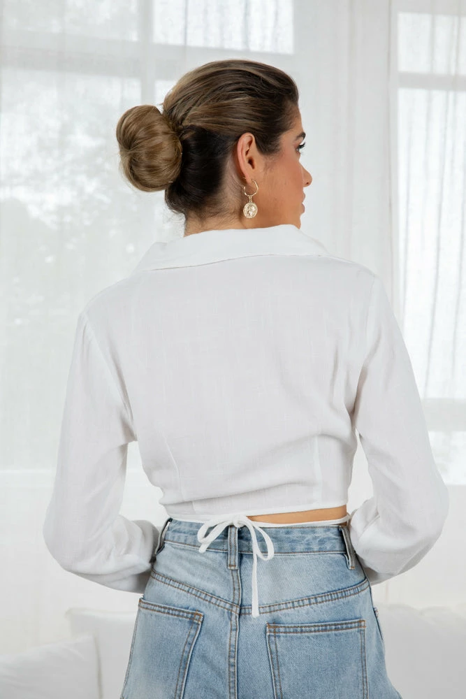 Our Clementina Top comes in a crisp white tone. It features a traditional collar, v neckline, long sleeves, buttons down the front, and a cropped length. This cute top pairs with high-waisted jeans or pants for a fun spring look!