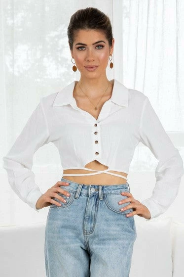 - Key Features: Cropped length. Relaxed fit. V neckline. Traditional collar. Buttons down the front. Long sleeves. Fabric waist tie. Tie at the front or back.