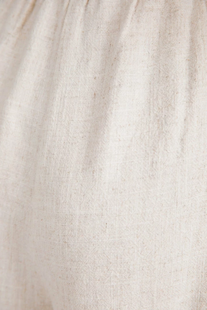 Our Caluya Playsuit comes in a beige tone and is perfect for those hot summer days. The V neckline met with buttons down the center of the dress, rolled up sleeves, gathered detailing on the waist, and fabric waist tie to cinch the waist makes this piece both practical and comfortable. Pair with your favourite tan sandals for an effortless look!