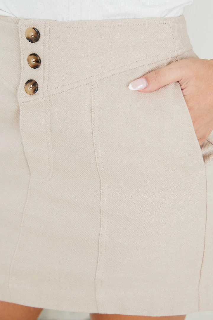 Our Channa Skirt comes in a classy beige colour. Fabulous and a little scandalous, this mini features a hip hugging silhouette and buttons on the mid waist. This pairs beautifully with thigh high boots.