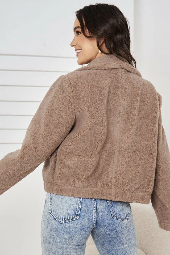 Our Corrine Jacket comes in a soft mocha brown tone. It features an oversized collar and buttons on the front for a warm, luxurious fit. This cute teddy jacket is perfect for layering during the cold winter months!