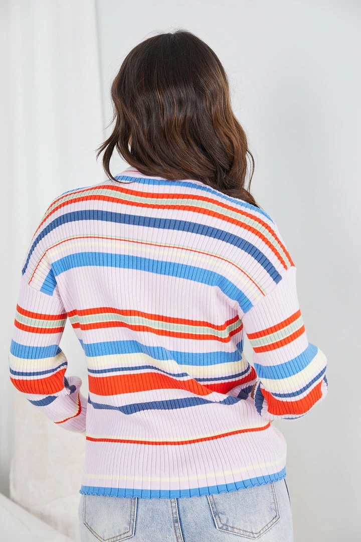 Our Dayla Knit comes in a beautiful stripe print in the shades of pink, red, blue, yellow and green. Like a candy from a store you can’t resist, this jumper is a sweet addition to your winter wardrobe. It features a round neckline, long drop sleeves and fun line pattern play in different hues that amazingly pairs well with a similar tone bottom and shoes!