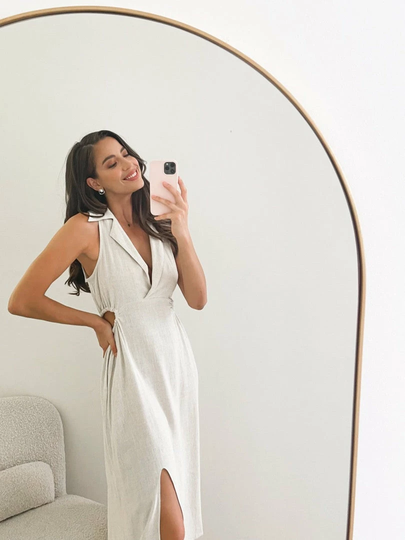 Our Denna Dress comes in a beige tone color. This dress features a classic collar, v neckline, with cut outs on the side and is fitted through the hip before falling to a midi length hem.