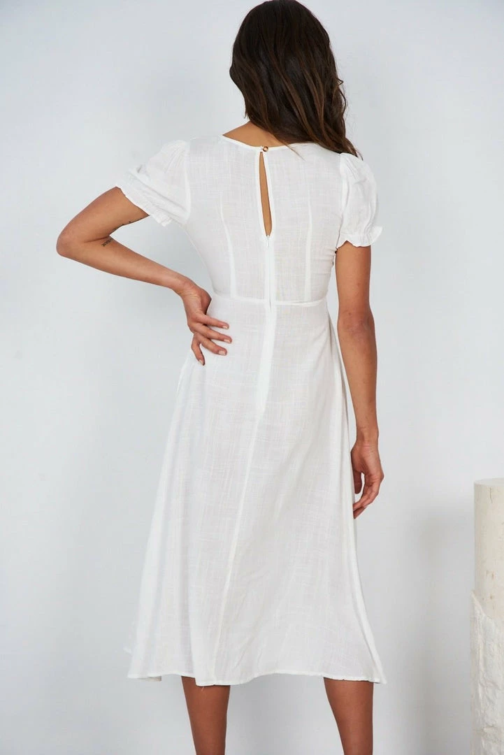Our Kiora Dress comes in a fresh white tone. It features a v neckline and short sleeves for a relaxed, comfortable fit. This flowy midi pairs beautifully with heels for an effortless transseasonal look!
