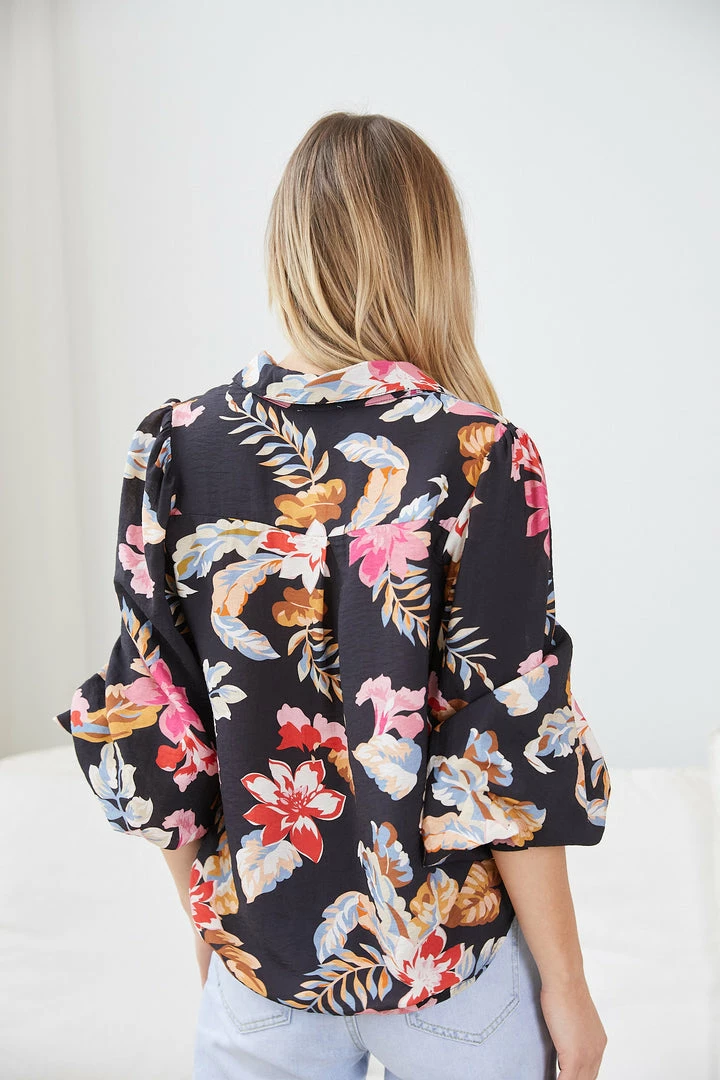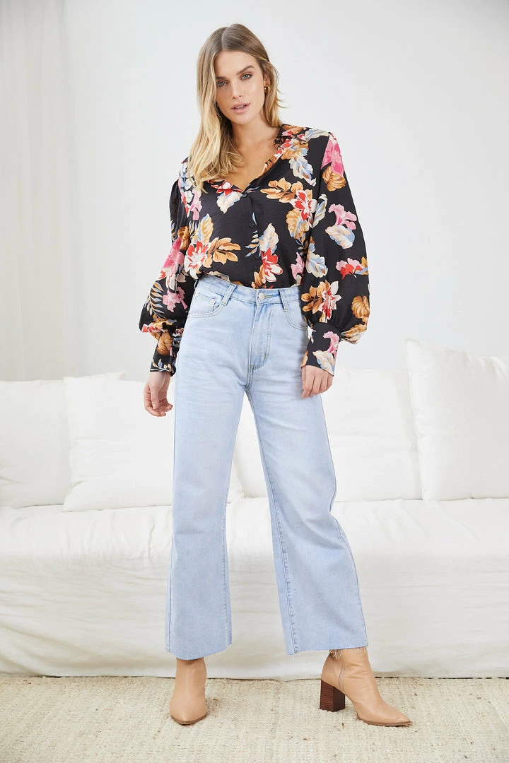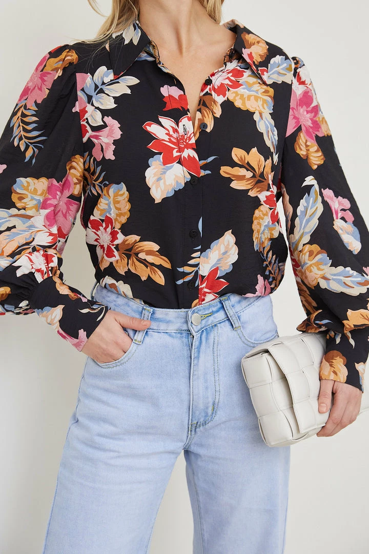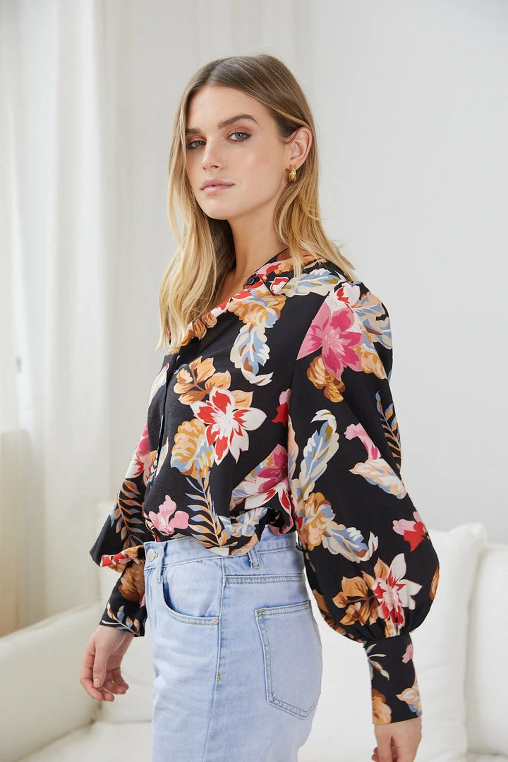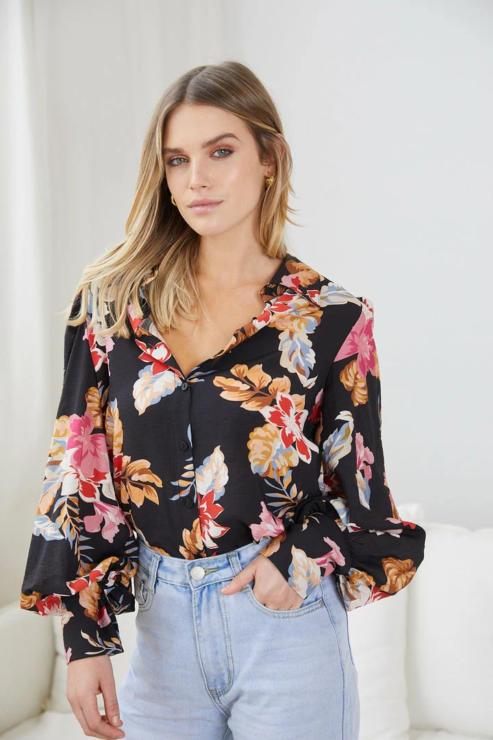 Our Odesha Shirt comes in a lovely black base with floral prints in diffent shades. Be a pretty sight to look at with this blouse that features a classic collar, centre-front buttons and long balloon sleeves. Turn your outfit into an exciting one by pairing this with our Gigi Jeans – Light Blue and almond toe pumps!