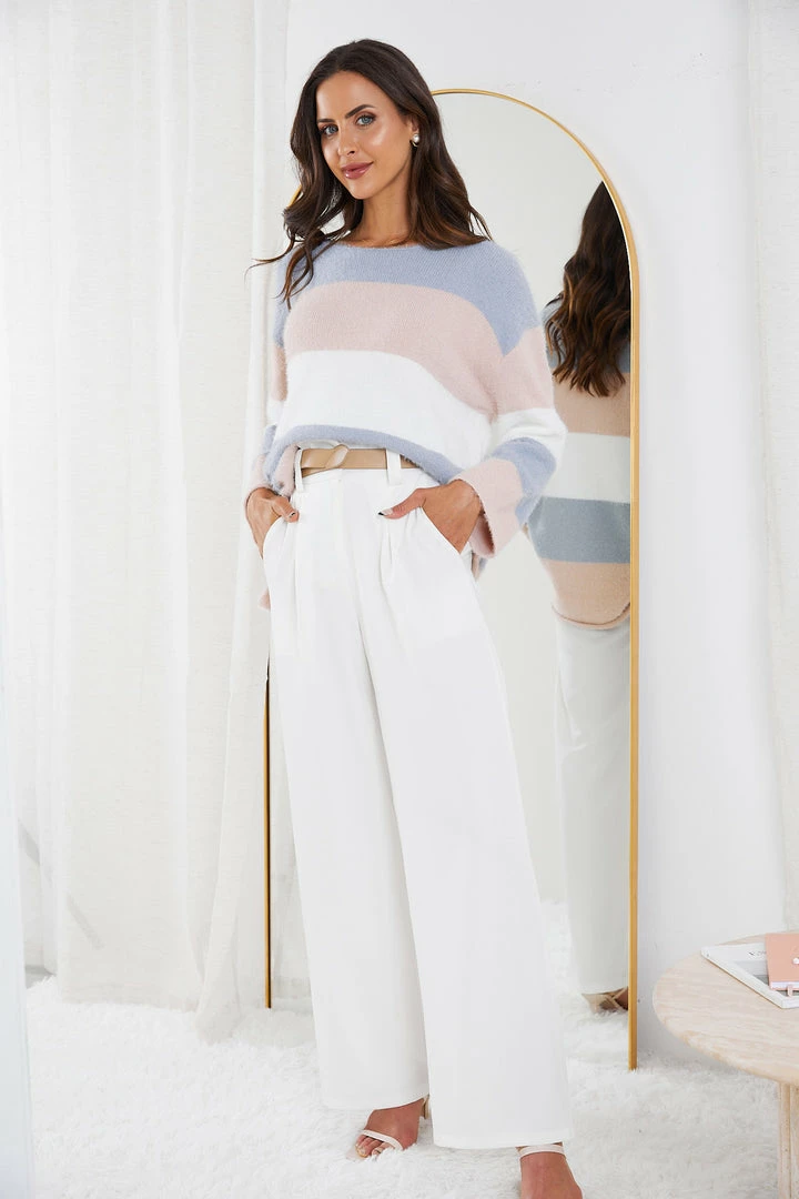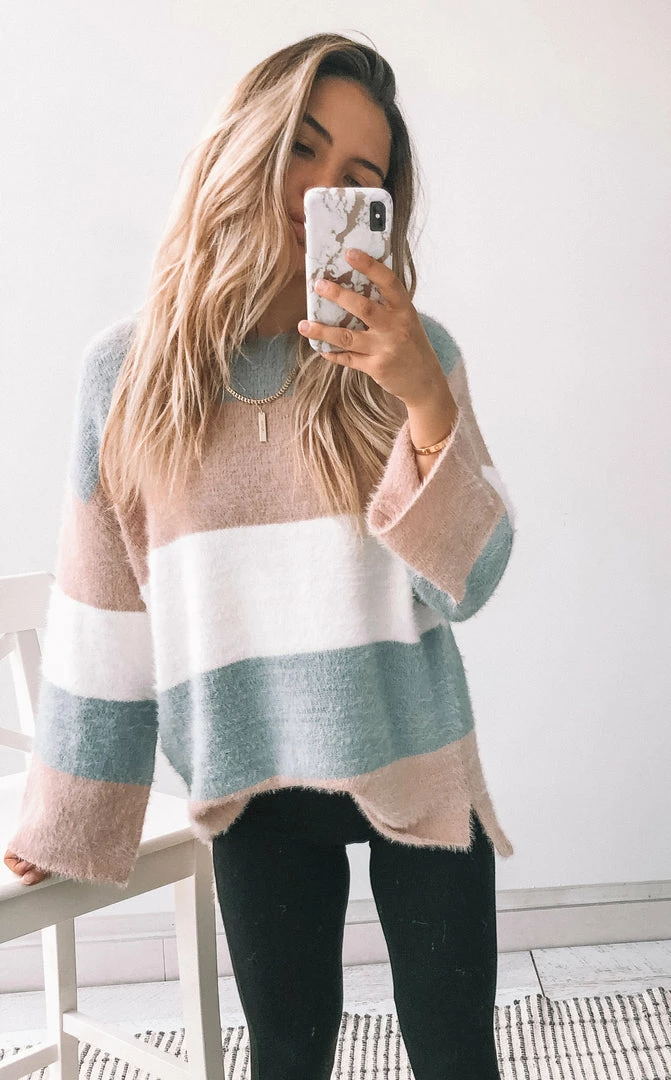 Our Pastella Top is back in a stunning neutral-multi toned knit, colours featured include pastel blue, pink, & ivory block stripe. It’s a lovely medium weight material with raw soft cuffs and hemline. The slight bateau neckline provides a delicate air to the garment making this an elegant edition to the wardrobe. The relaxed long sleeves and fit make this perfect for growing bumps.
