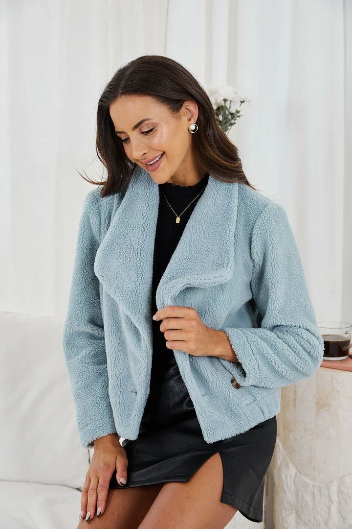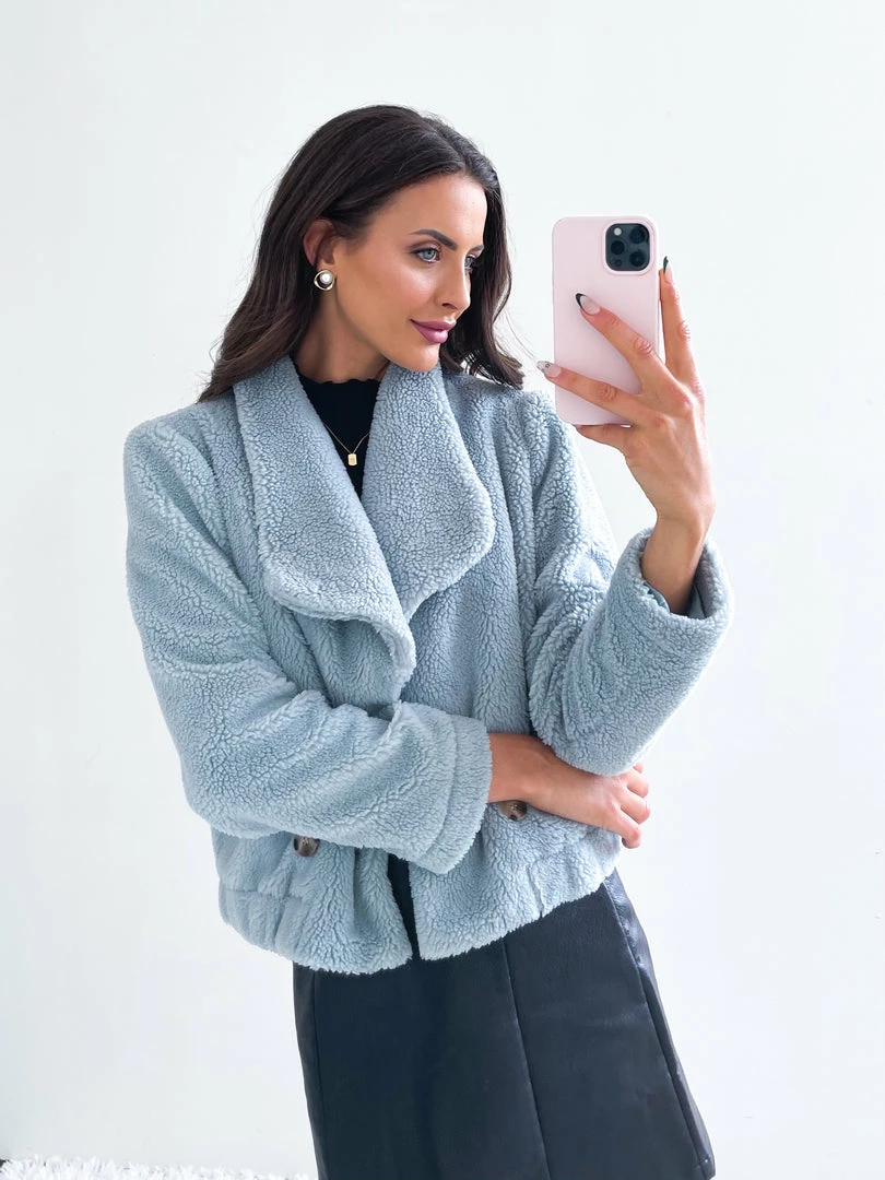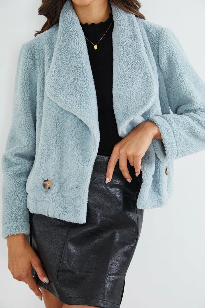 Our Corrine Jacket comes in a soft light blue tone. It features an oversized collar and buttons on the front for a warm, luxurious fit. This cute teddy jacket is perfect for layering during the cold winter months!
