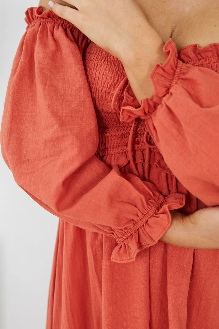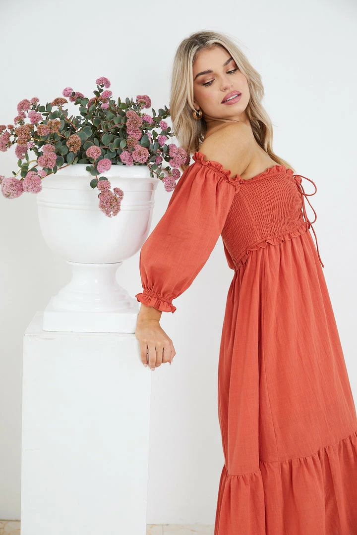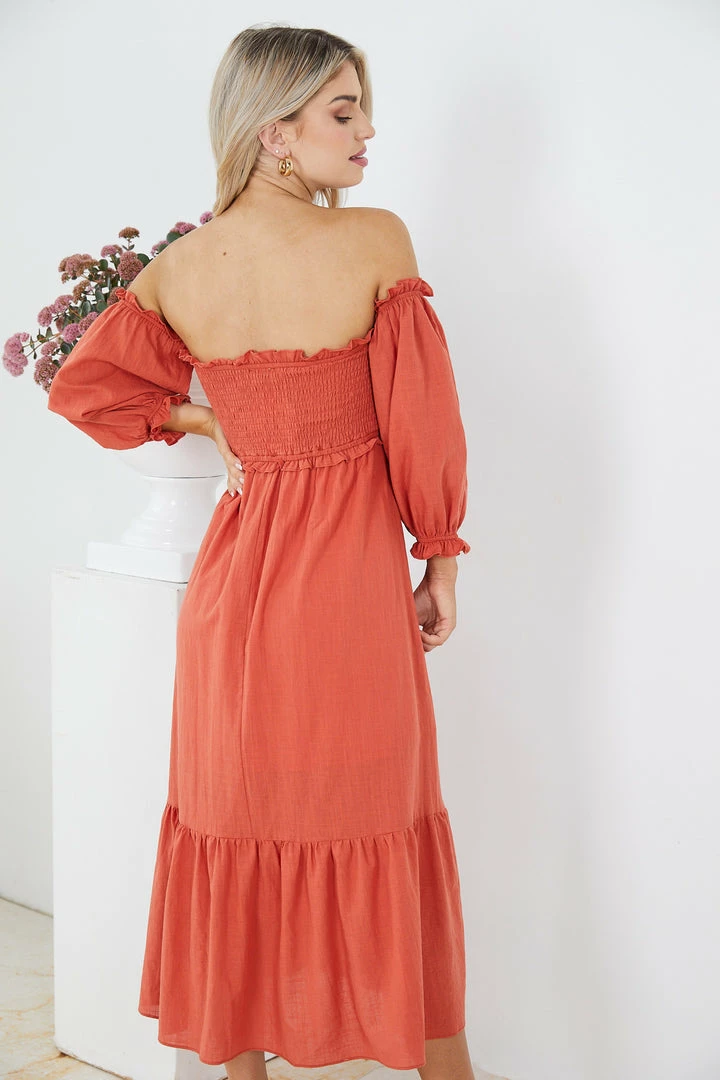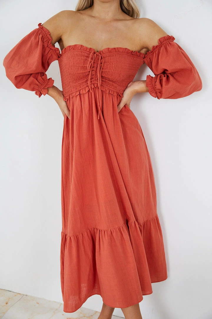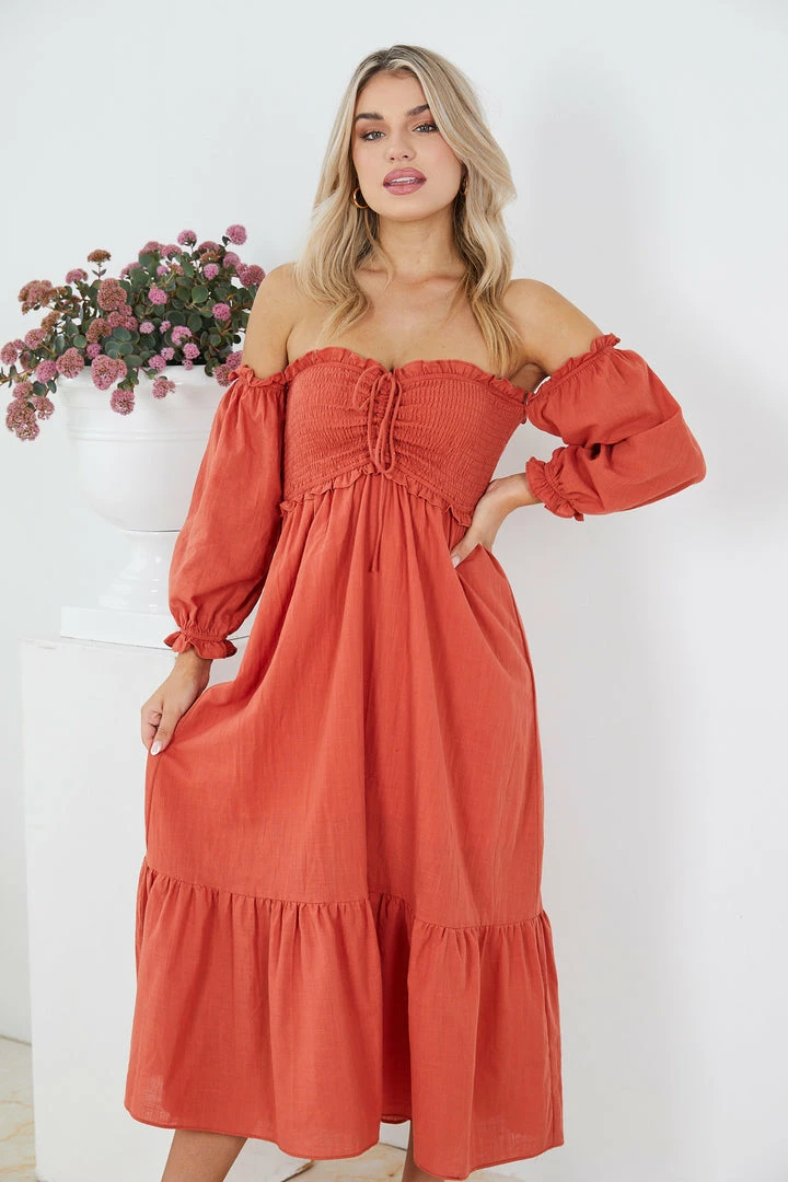 Our Donita Dress comes in a rust color. This dress features an off-shoulder long sleeve, a sweetheart neckline, gathered fabric on the bust, and a flowy skirt. Paired with a sunhat and flats – this piece is perfect for weekend picnics!