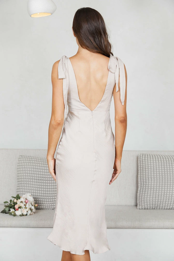 Our Eleanora Dress is a dream featuring in a champagne color. The tie shoulder straps and v neckline with tucked fabric under the bust are a flattering addition to this peice. Perfect for evening parties, work and business Casual! This feminine & whimsical number is practical & fun, making it the best of both worlds.