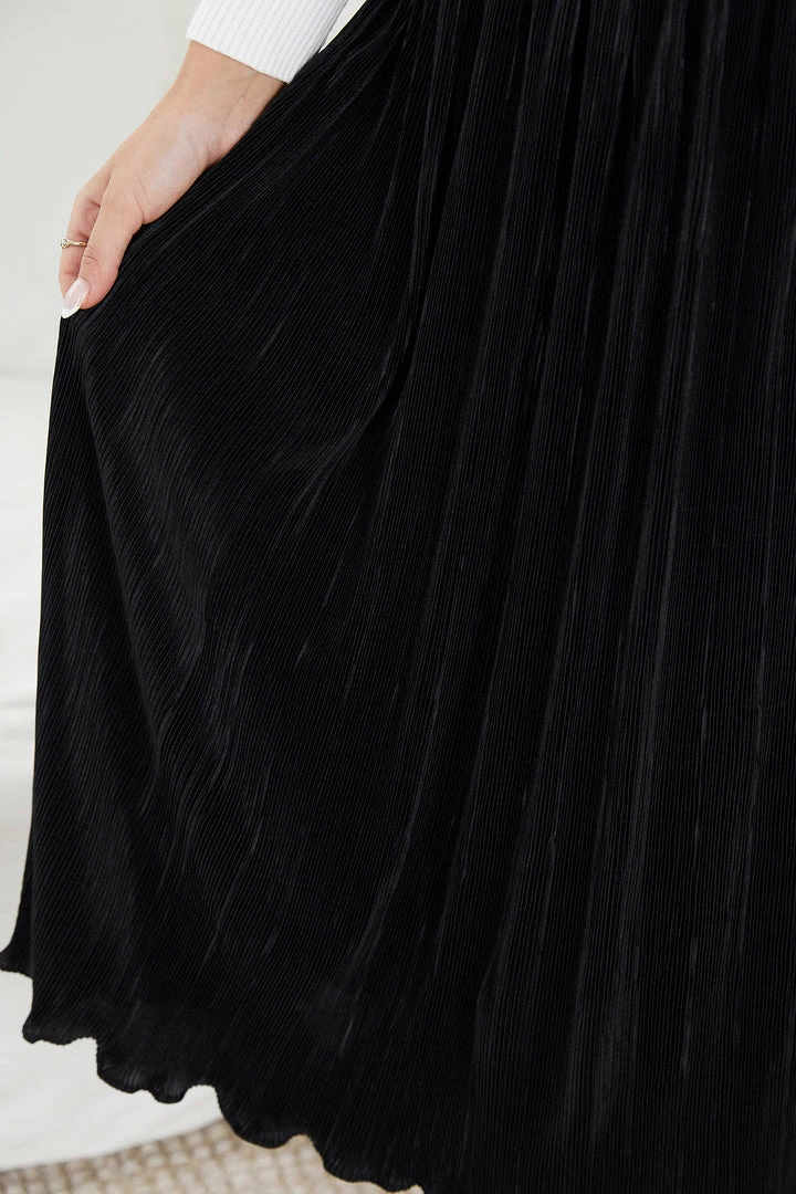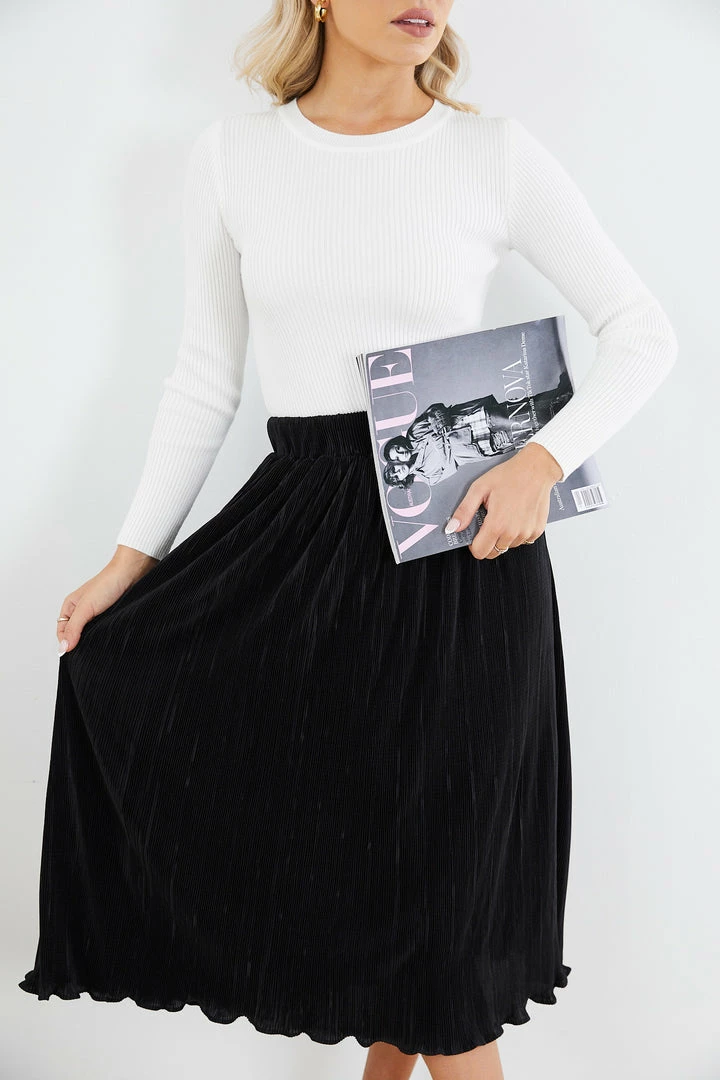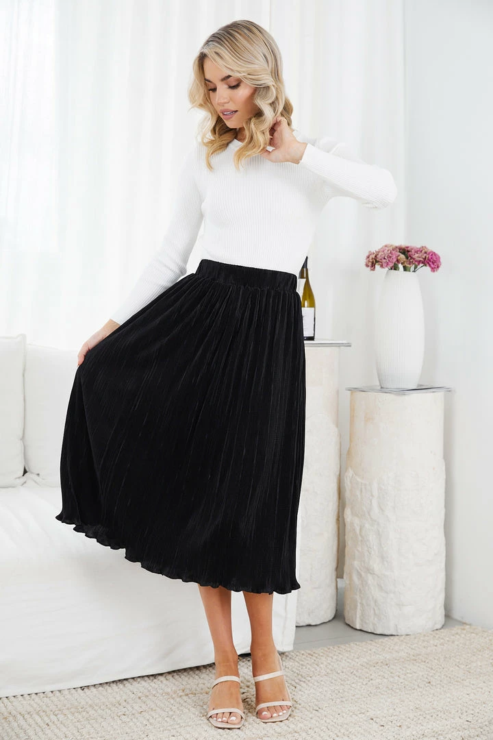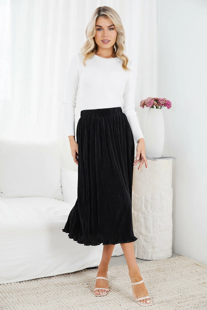 Our Elisheba Skirt comes in a sophisticated black colour. Lead the fashion revolution in confidence in this midaxi length skirt featuring a waistband and a plisse fabric creating a captivating texture to its look. Pair with sling back heels for a vintage chic outfit.