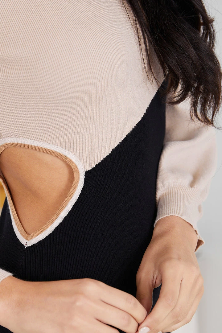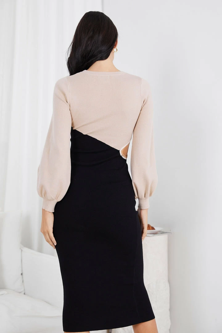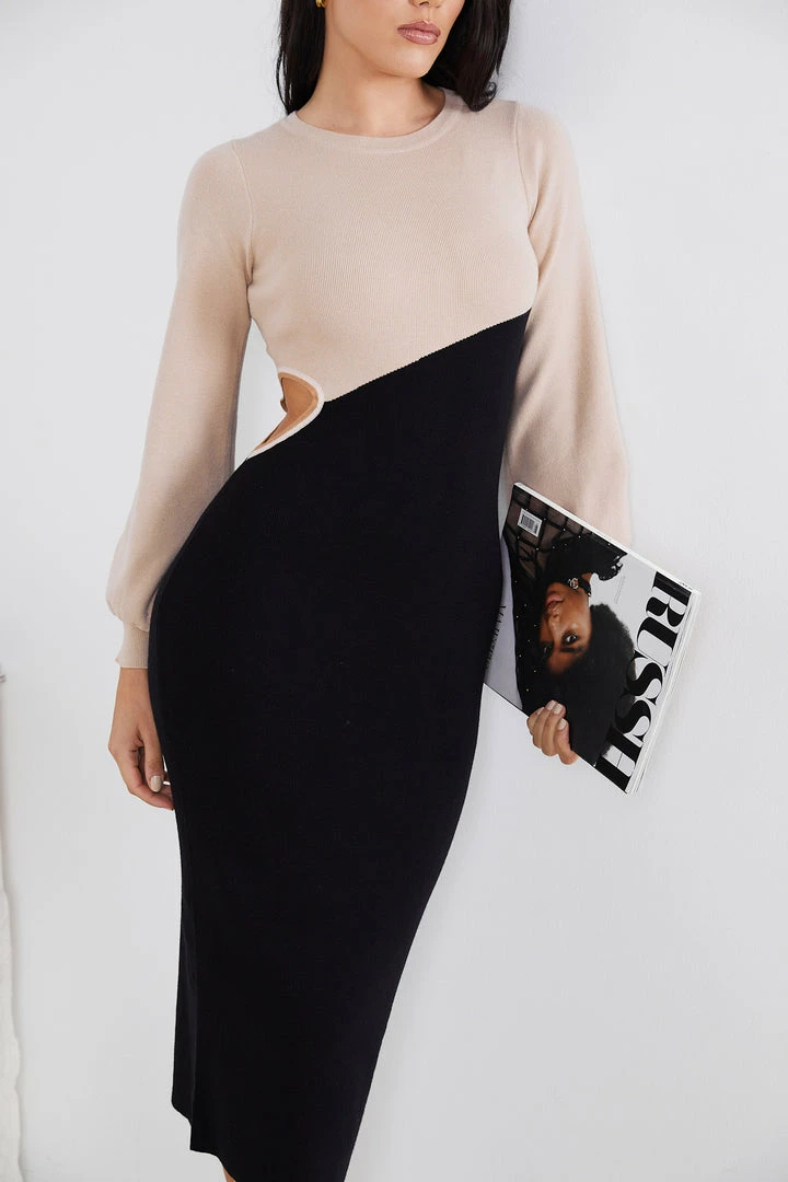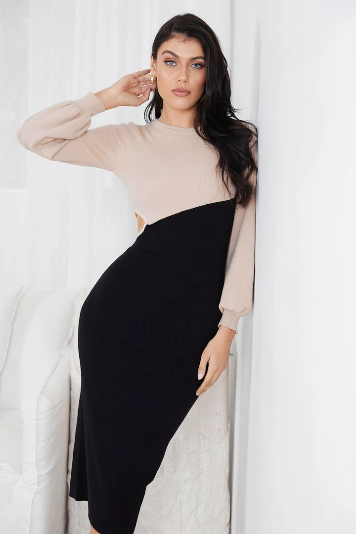 Our Haley Knit Dress comes in a beautiful contrasting colours of black and camel. Fashionably stitched together with the influential woman in mind, this bodycon is designed with a round neckline, long cuffed bishop sleeves, side waist cutouts, midi length and colour blocking detail. Elevate your look with leather sandals and a pair of cute earrings!