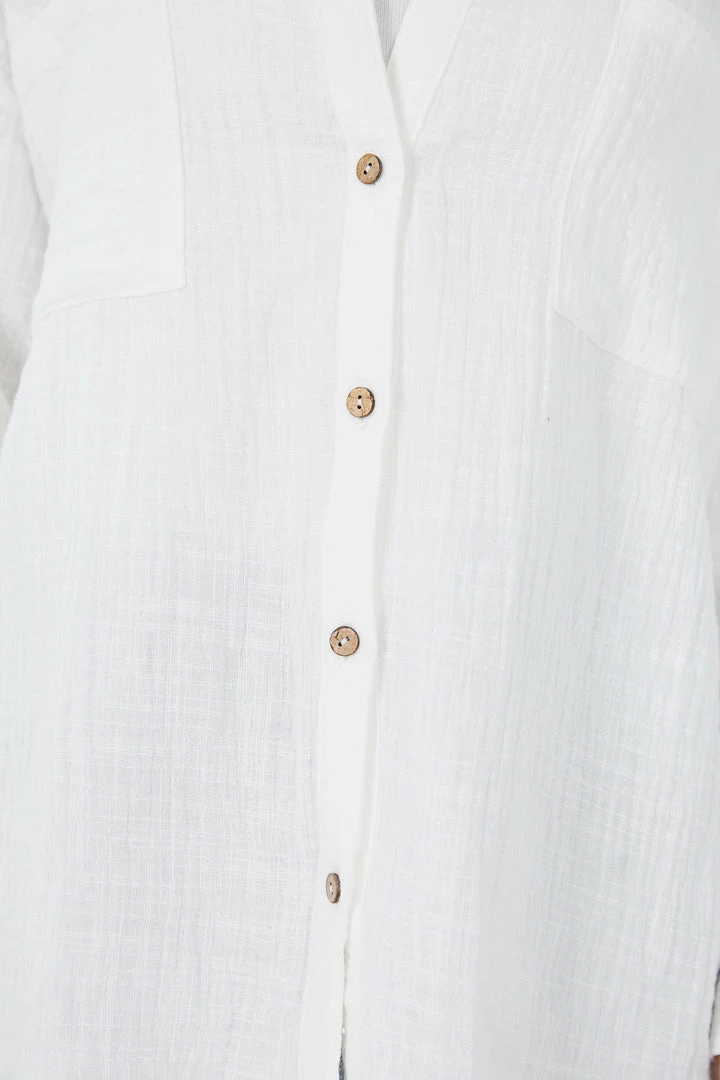Our Helenus Shirt comes in a white tone color. Create a timeless look in this classic long-sleeved shirt. Made with a cotton blend material, the fit is oversized, featuring a collared neckline, chest pocket, and button-down fastening. Throw it on as a light layer over printed summer dresses, or tuck it into jeans or trousers – either way, this piece will be a staple in your wardrobe throughout the seasons.