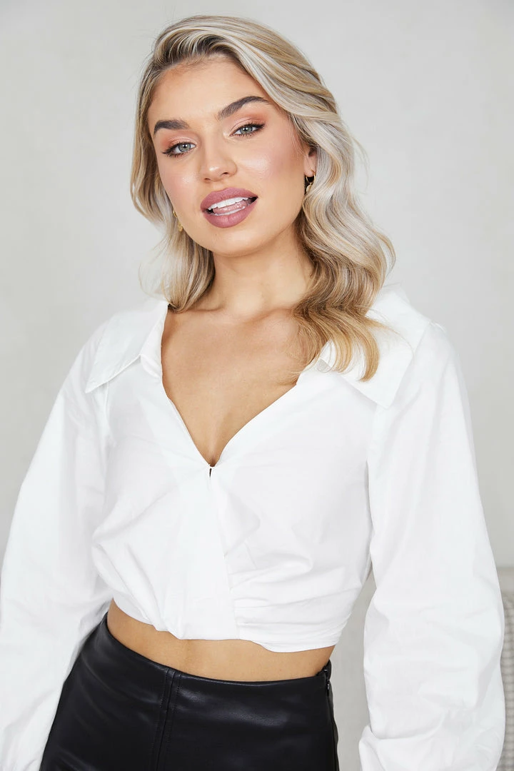 Our Henie Top comes in a white color. This crop top features a classic collar, v neckline, long sleeves that are cinched at the cuffs. Team it with easy high waisted denim or printed skirts to set off a chic vibe!