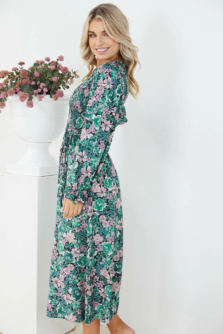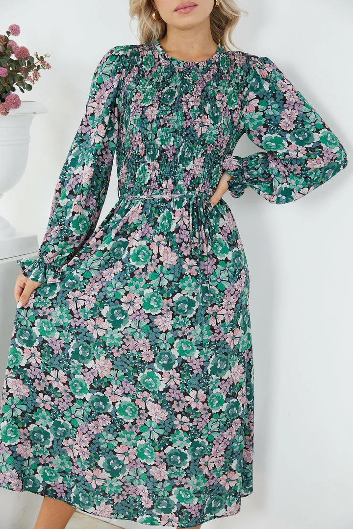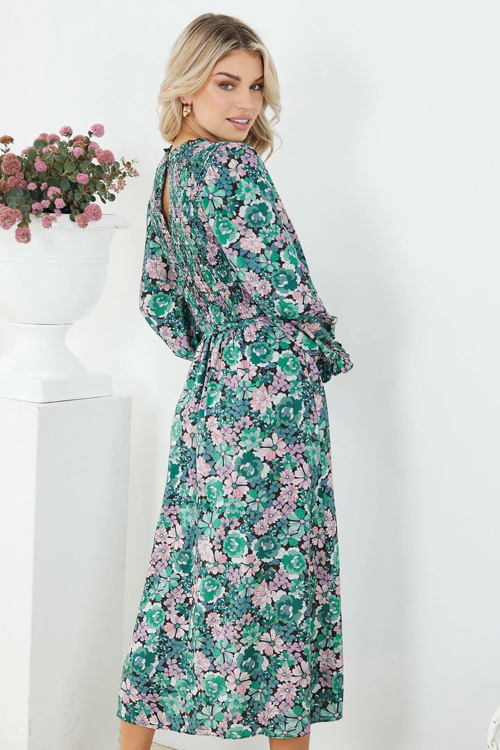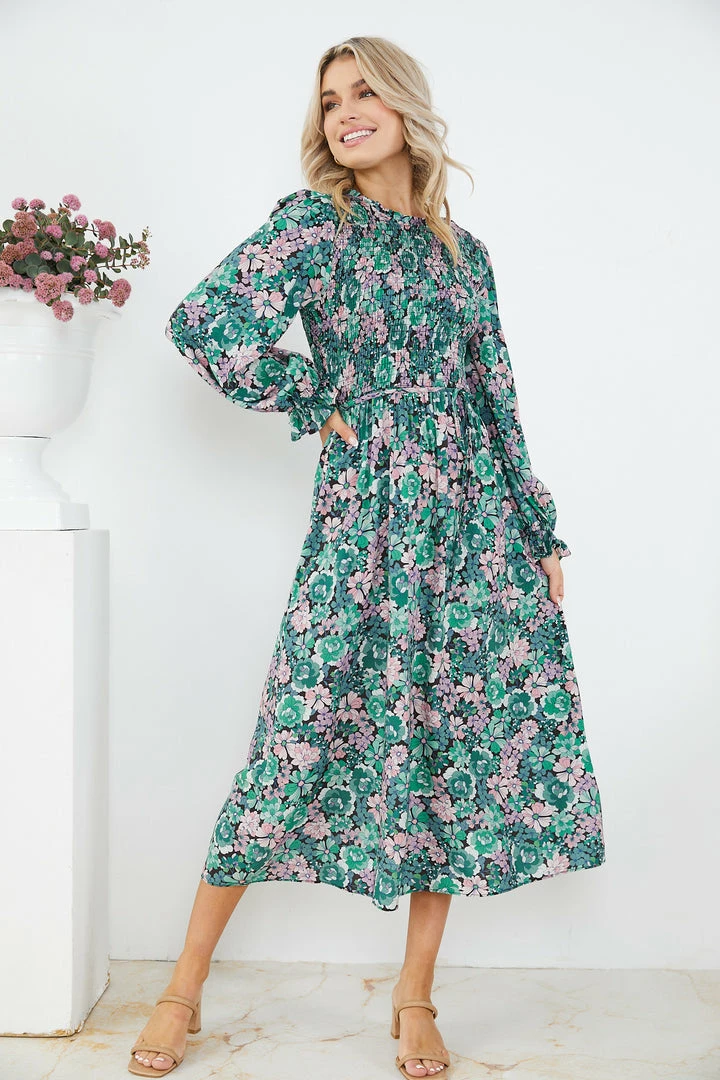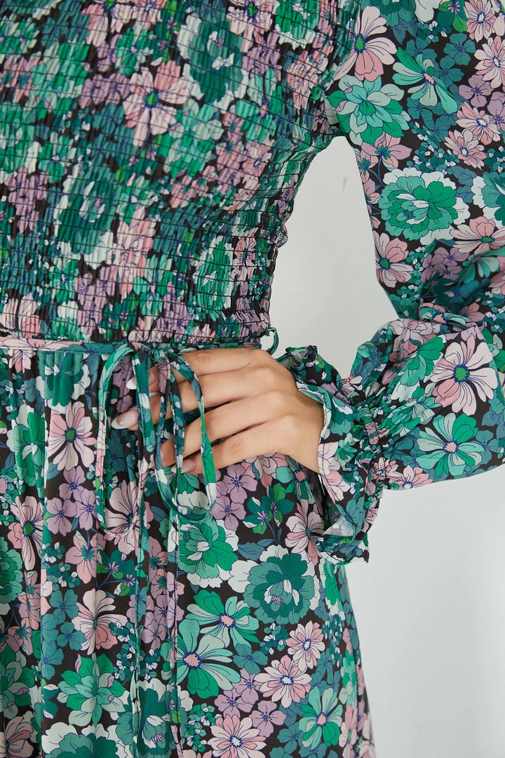 Our Holta Dress comes in a black tone base with green and blush floral prints. This midi features an elastic bodice that promotes comfort, long cuffed sleeves, and a flowy skirt. A figure-flattering silhouette will draw every eye in the room.