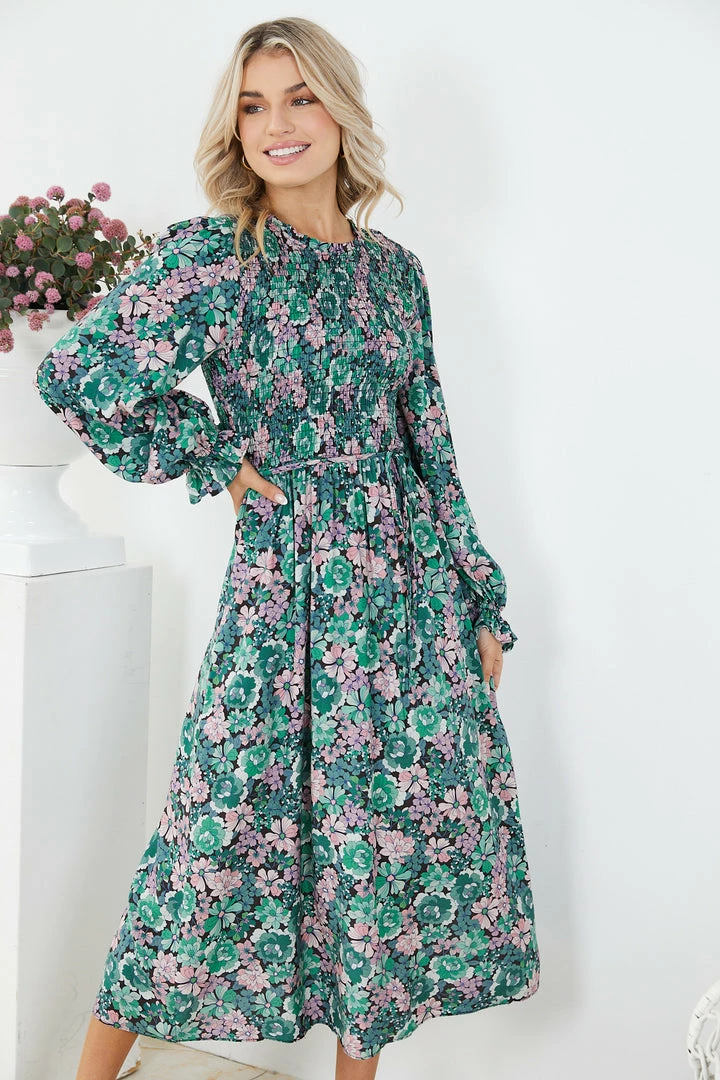 - Key Features: Midi length. Long cuffed sleeves. Elastic bodice. Flowy skirt. Relaxed fit. Maternity friendly. Self tie waist belt. Shirred bodice
