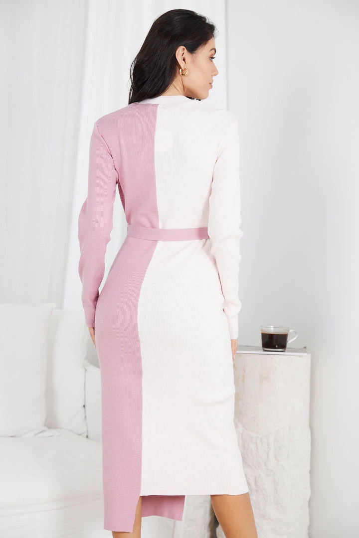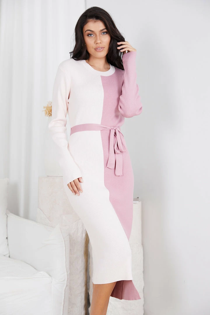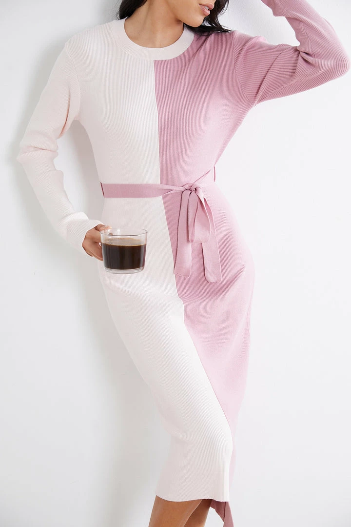 Our Ivane Knit comes in a beautiful colour blocking in the shades of pink. When in doubt, be extra in this knit dress that is designed with a round neckline, long sleeves, paneled detailing, fabric waist tie, midaxi length and asymmetrical hemline.