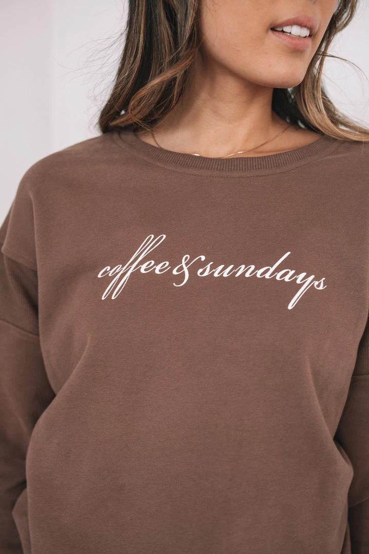 Our Koffee Jumper comes in a chocolate tone featuring a ‘coffee & sundays’ print in white. This pull-on jumper features a round neckline and rib detailing on sleeves and hem. This cozy piece is perfect for relaxing into the weekend with a big cup of coffee.