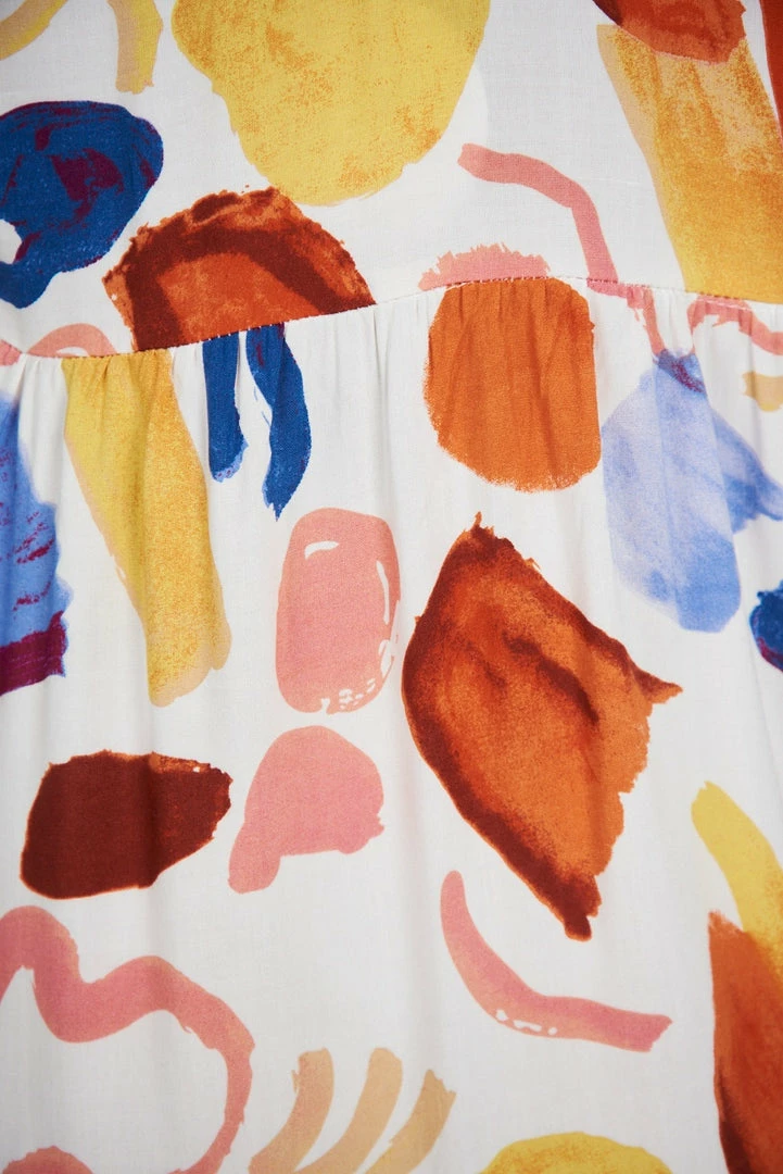 Our Kolour Dress comes in a white tone base, with a rust, gold & blue tone print. It features a round neckline & adjustable straps for a relaxed, comfortable fit. This flowy midi pairs beautifully with heels for a stunning spring look!