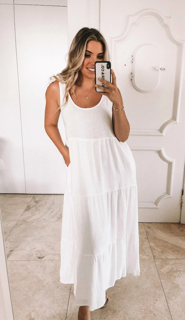 Our Lydia Dress comes in a classic fresh white tone. This relaxed midi features a scoop neckline, tie detailing on the shoulder straps, and tiered skirt with gathered detailing. Paired with a sunhat and tan sandals, this piece is perfect for a balmy day look!