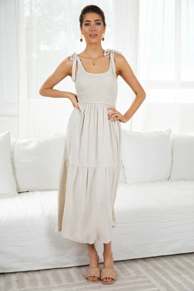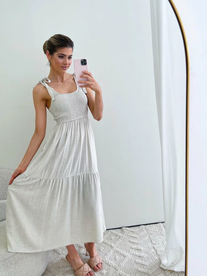 Our Martha Dress comes in an earthy beige tone. It’s a sleeveless midi that features a round neckline and adjustable straps for a relaxed, comfortable fit. This flowy midi pairs beautifully with heels for an effortless look this summer season!