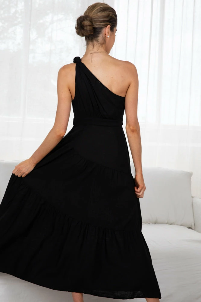 - Key Features: Midi length. One shoulder. Knot detail on sleeve. Gathered fabric on waist. Asymmetric neckline. Tiered skirt.