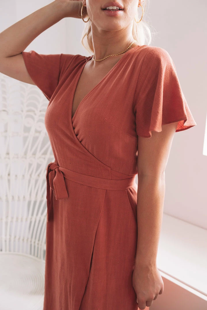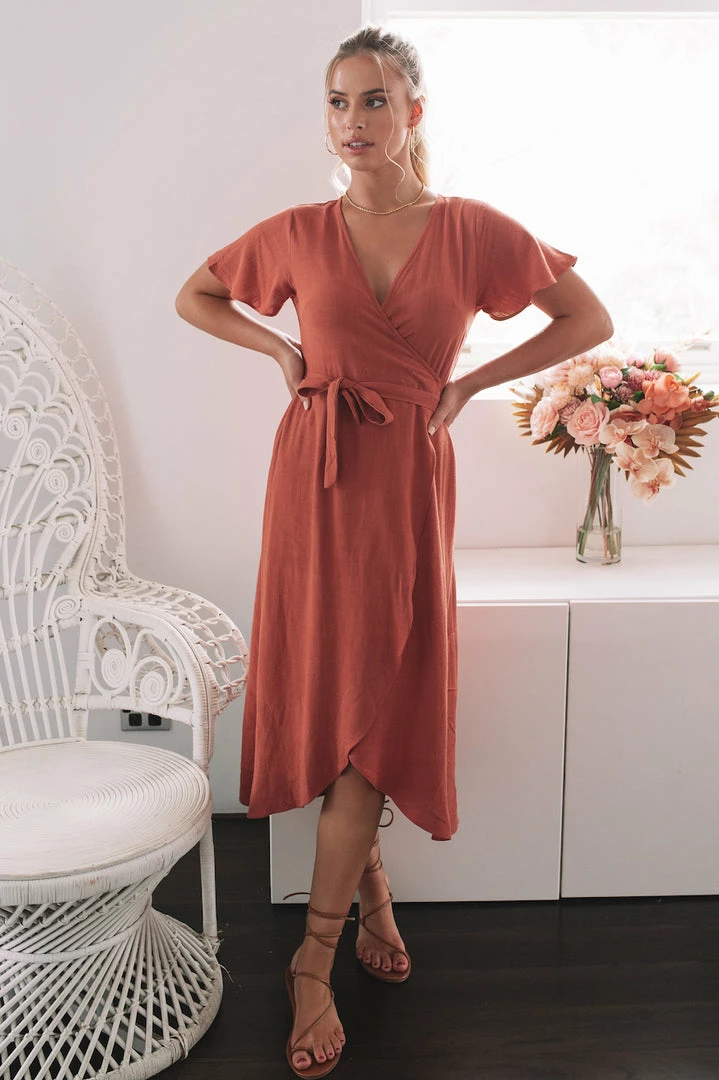 Our Tended Dress is a stunning rust with red undertones. This medium-weight material flows below the knee making this dress perfect for summertime. It features short sleeves and high low hemline making this an easy choice for everyday wear that can be dressed up or down. The wrap style dress ties on the wearer’s left.