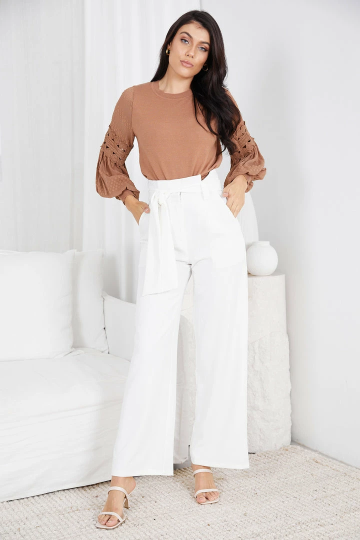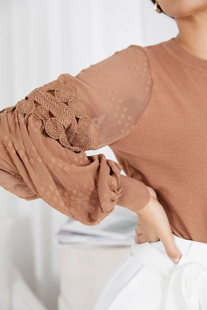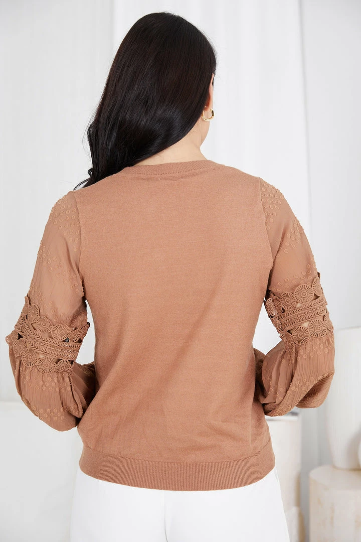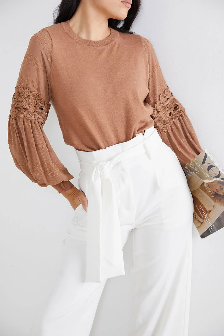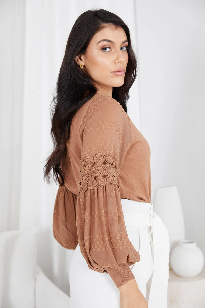 Our Tia Top comes in a brown camel tone. It features a round neckline, long relaxed sleeves, and an embroidered pattern on the sleeves. This versatile top is perfect for casual outings with the girls, or taking on the day in the office!