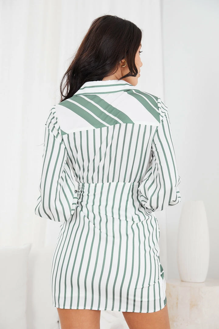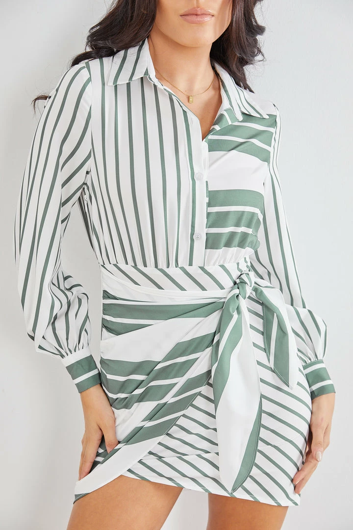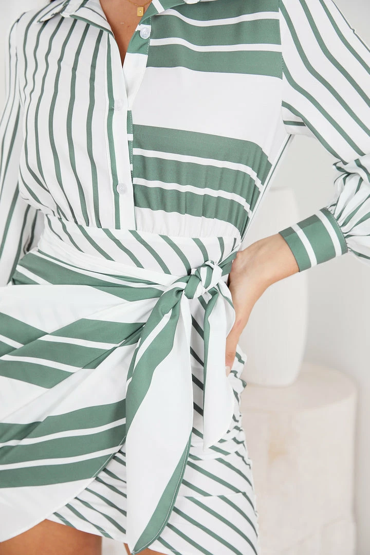 Our Princesse Dress comes in a milky white base and khaki stripe. All about graphic line movement, this mini is inspired by the classic shirt dress but with a twist. It features a shirt collar, functional front buttons, long cuffed sleeves, wrap skirt with side tie detail and is the perfect pair with closed pump heels!