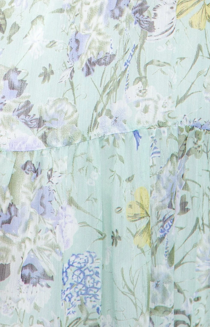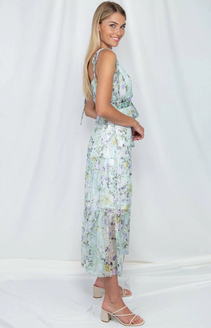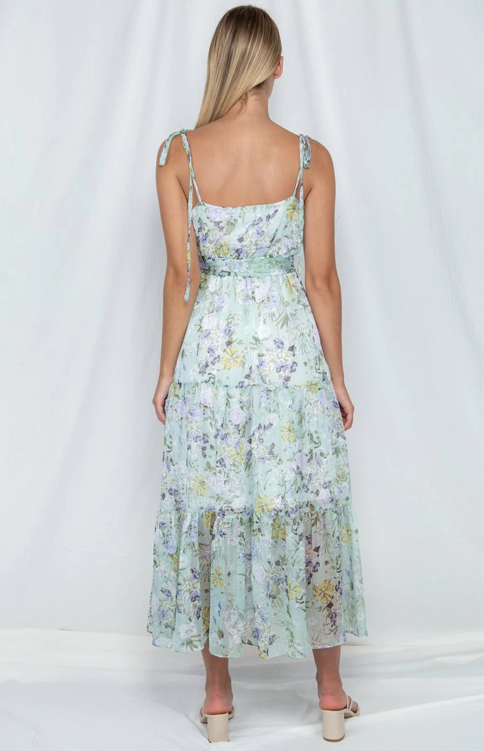 Our Streama Dress comes in an elegant mint tone featuring a rose and blush floral print in a relaxed fit. This stunning midi features spaghetti straps with bow detailing, complimented by the v neckline and fabric waist tie which cinches in the waist. The tiered skirt makes this an effortless and flowy piece, perfect for weddings and baby showers.