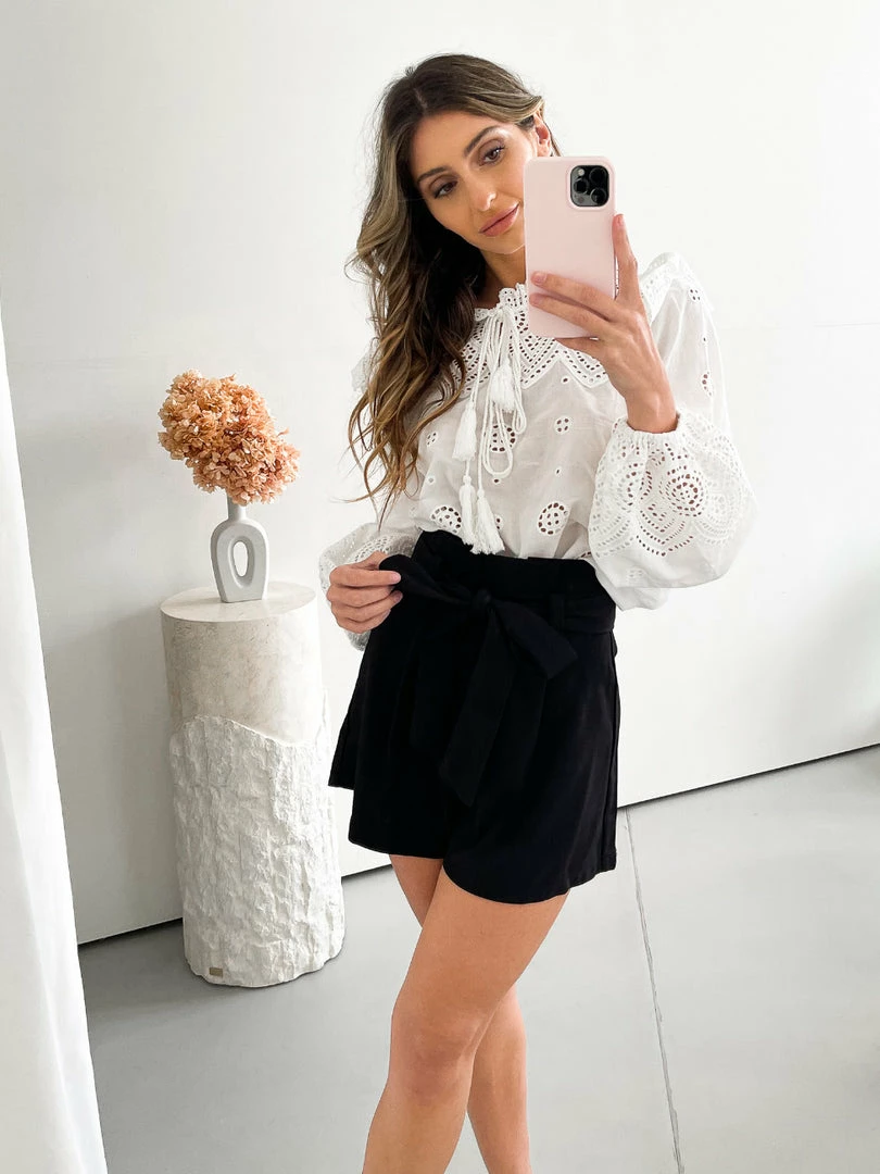 Our Felina Shorts come in a deep black tone. They feature a mini-length, belt loops around the waist, and a fabric belt to cinch in the figure beautifully. These versatile shorts are the perfect styling piece for the warm spring/summer months!