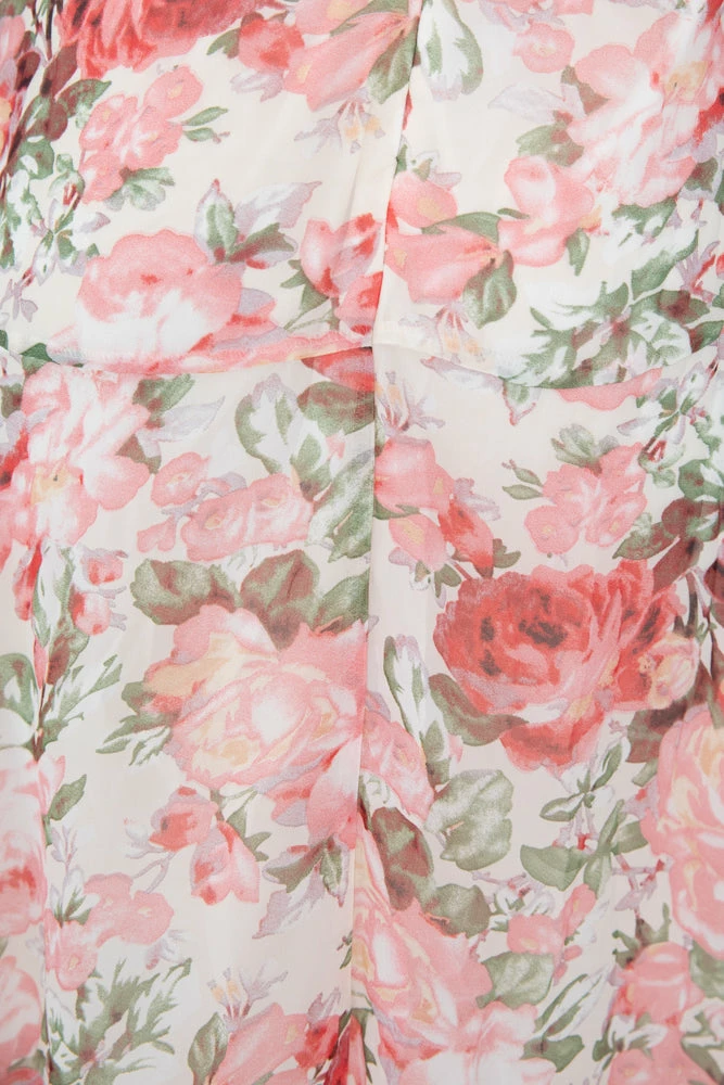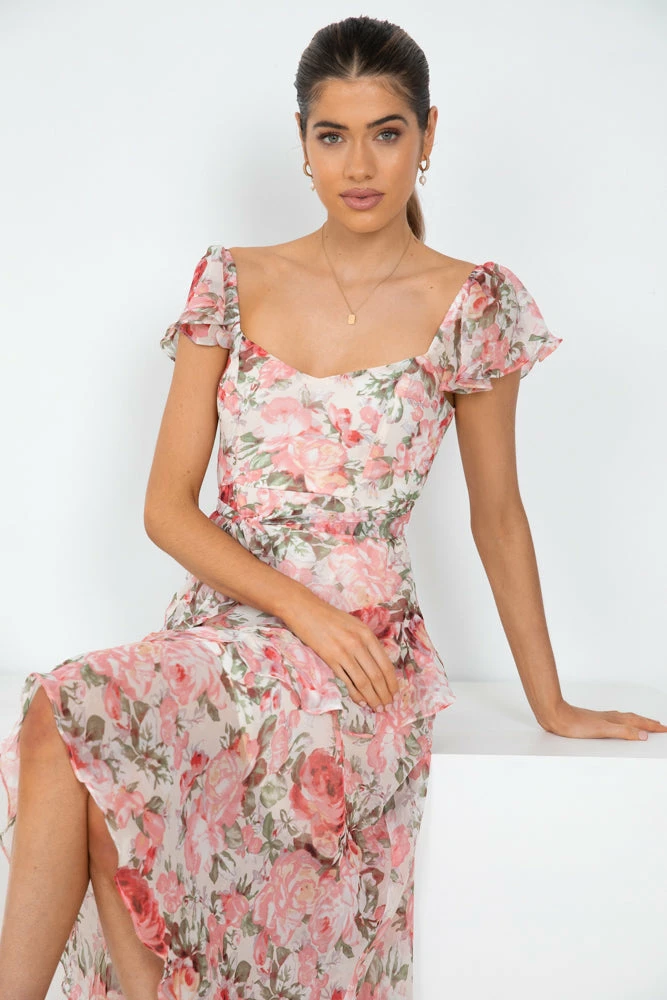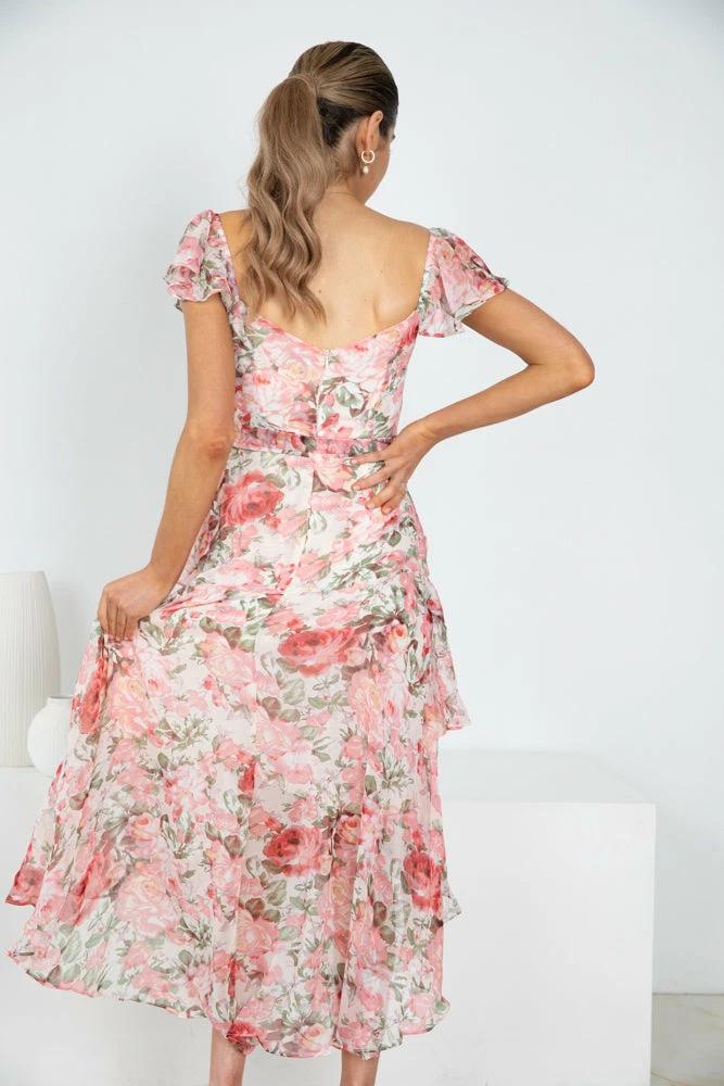 Our Fluttering Dress is a feminine dream. This stunning maxi comes in a pink base featuring a pink, sage & red toned floral print. The soft V neckline, flutter sleeves, adjustable fabric waist tie, and high low hemline are beautiful additions to this piece. Pair with your favourite nude strappy heels for an effortless and dreamy look.