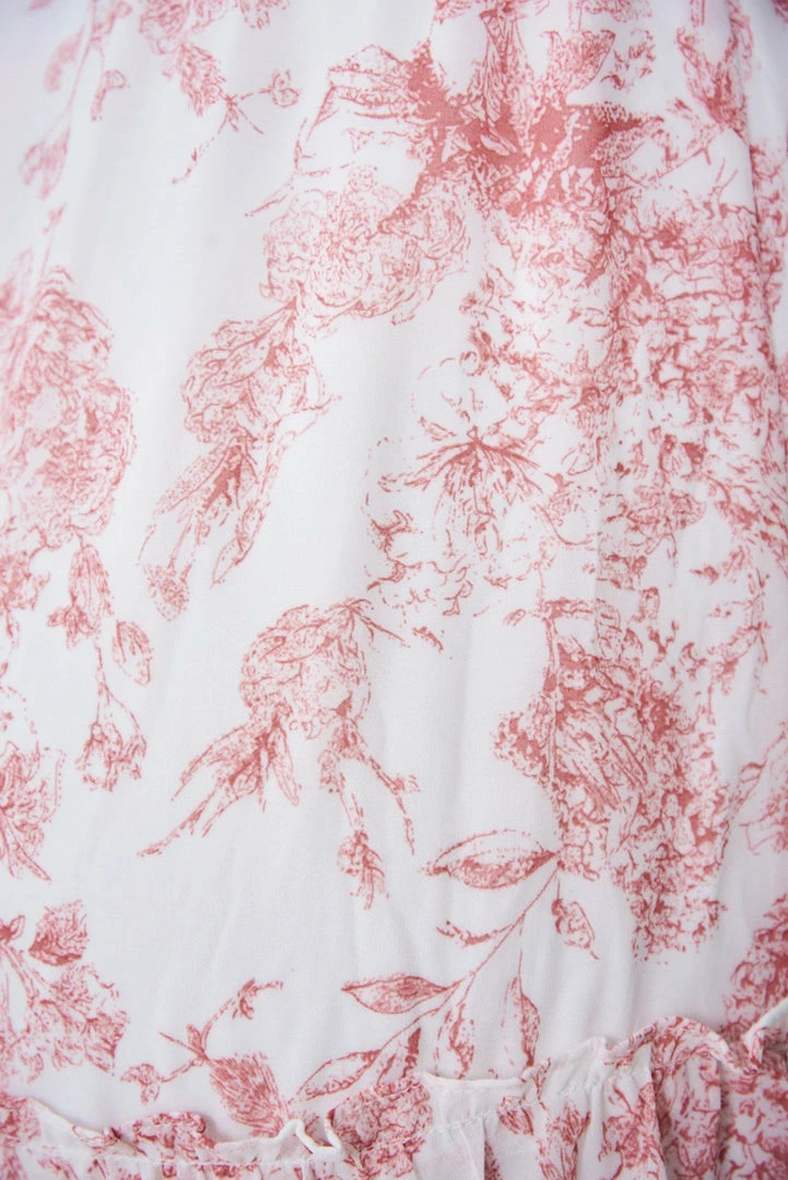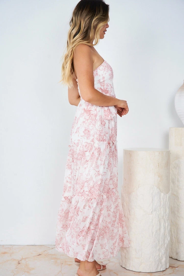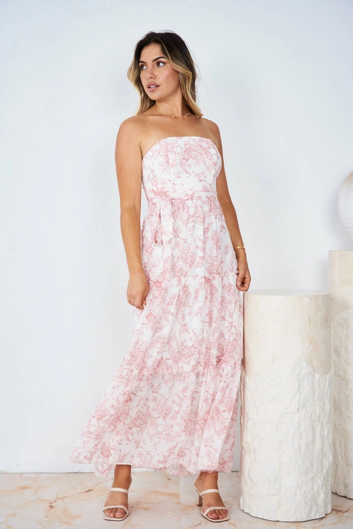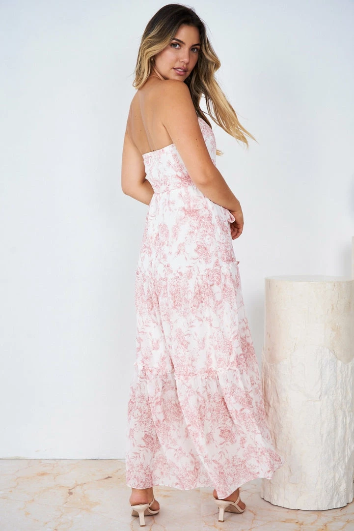 Our Kathleen Dress comes in a white tone base, with a pink tone print. It’s a sleeveless midi that features a strapless neckline for a relaxed, comfortable fit. This flowy midi pairs beautifully with heels for a stunning seasonal look!