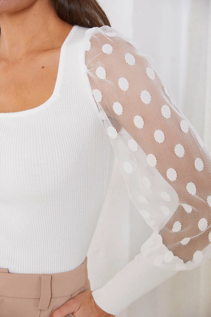 - Key Features: Square neckline. Knit bodice. Sheer long sleeves with spot print and macro cuffs.