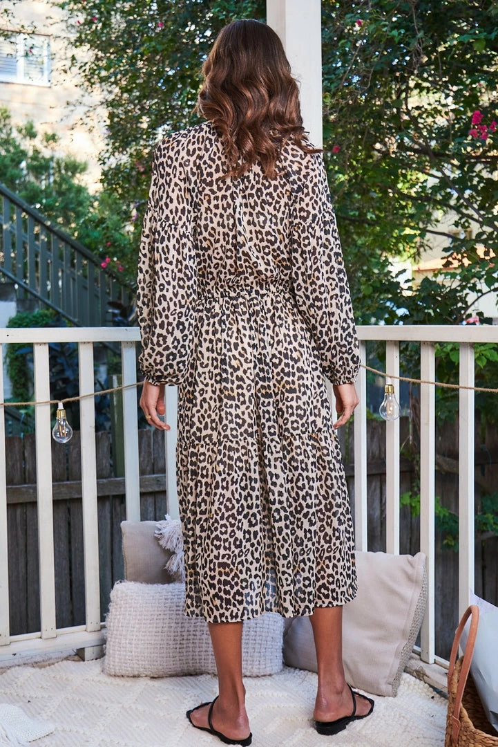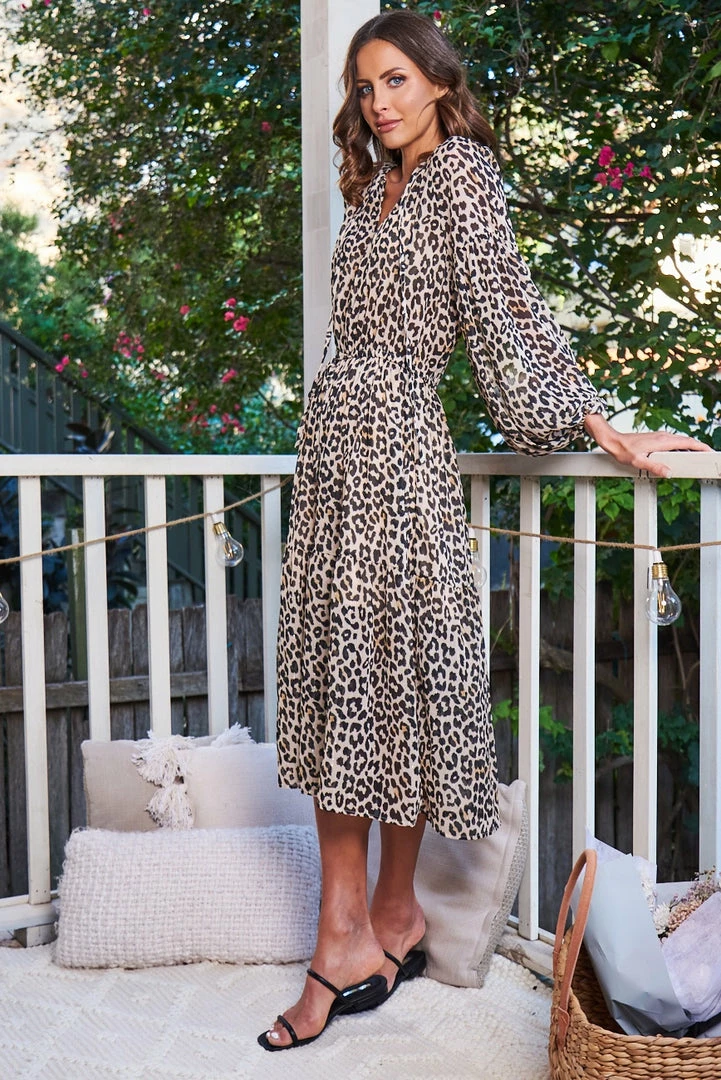 Our Rowena Dress comes in a striking leopard print. It features a v neckline, long bishop sleeves, and a fabric waist tie to cinch in the figure beautifully. This stunning midi pair beautifully with boots or heels for an effortless transseasonal look!