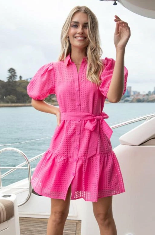 - Key Features: Classic Collar. Mini length. V neckline. Puff short sleeves. Fabric waist tie. Tiered skirt. Buttons down the front.