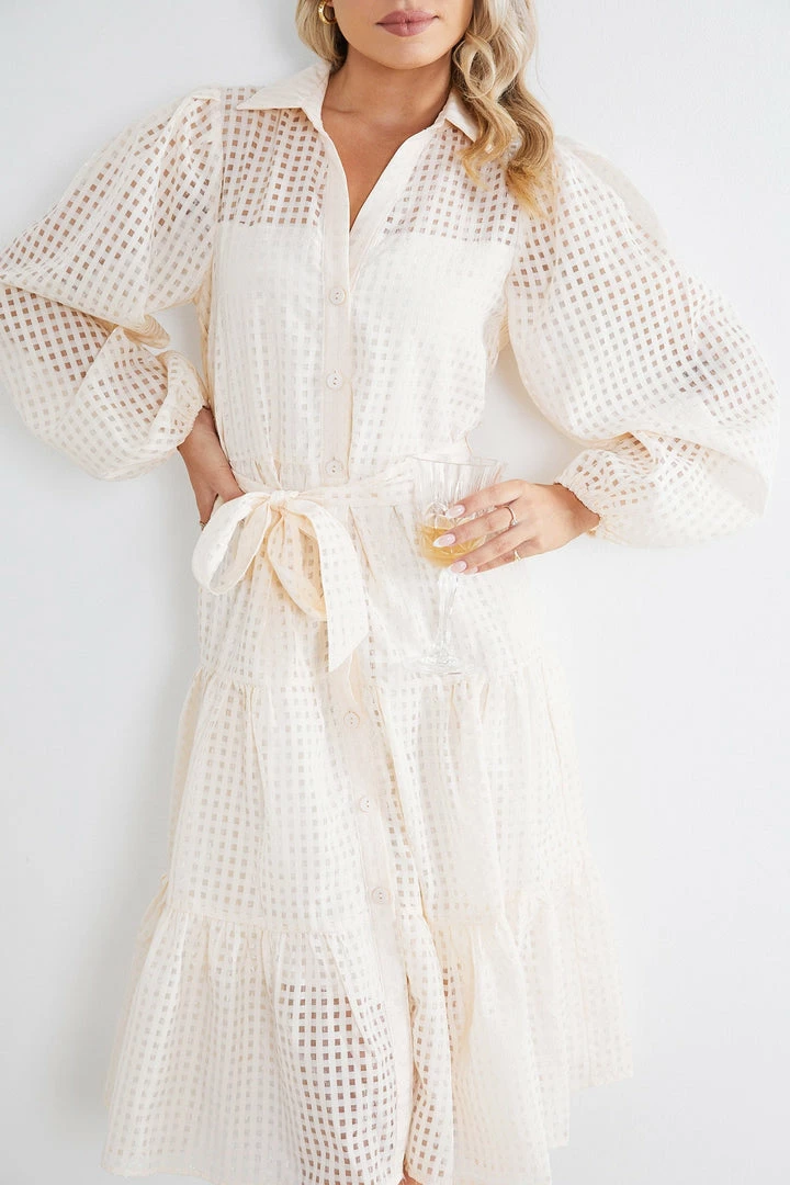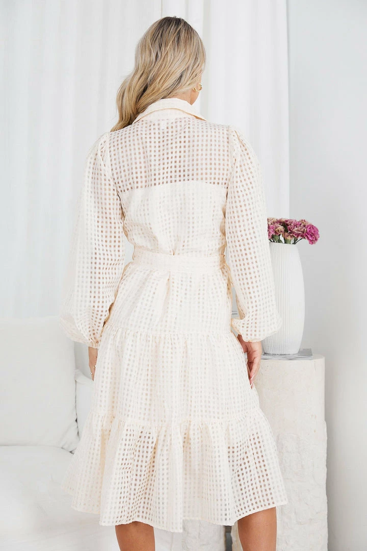 Our Notepad Dress comes in a gorgeous cream tone color in a medium weight, relaxed fit midi length. The v neckline, classic collar, long sleeves, tiered skirt and buttons down the front are fab additions to this midi that you’re sure to love as the weather begins to cool.