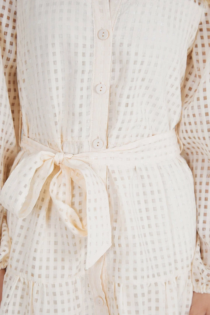 - Key Features: Classic Collar. Midi length. Long sleeves. Cinched Cuffs. V neckline. Puff sleeves. Fabric waist tie. Tiered skirt. Buttons down the front.