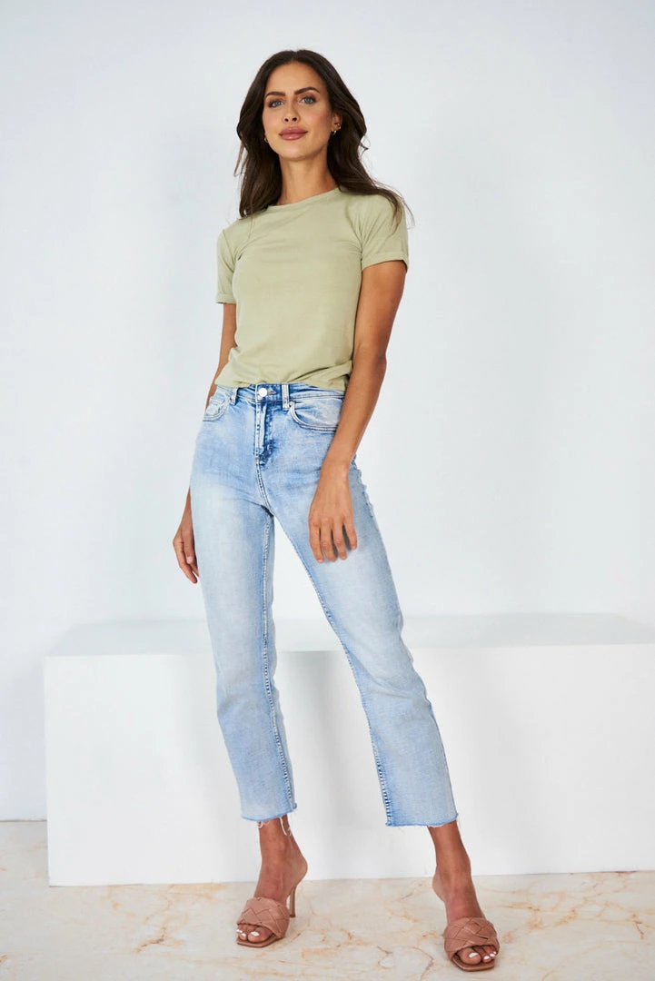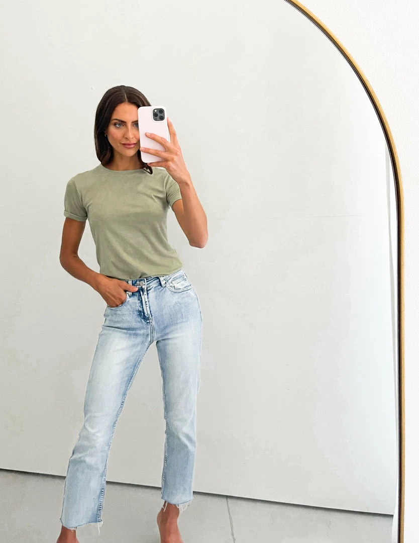 Our Primed Top is a khaki green tone. It is the sister of our bestselling Primary Top. It’s a gorgeous lightweight material, in a relaxed fit ideal for everyday wear. The classic tee silhouette pairs perfectly with all kinds of bottoms making this your next go-to item.