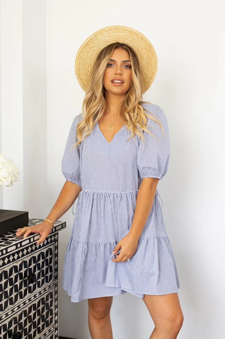 Our Rhea Dress comes in a stunning navy and white micro stripe print. This relaxed mini features a soft V neckline, cinched puff sleeves, an adjustable waist drawstring with tie detailing on the sides of the waist, and tiered skirt with gathered detailing. This summery piece is perfect for beach-side activities on a balmy day.