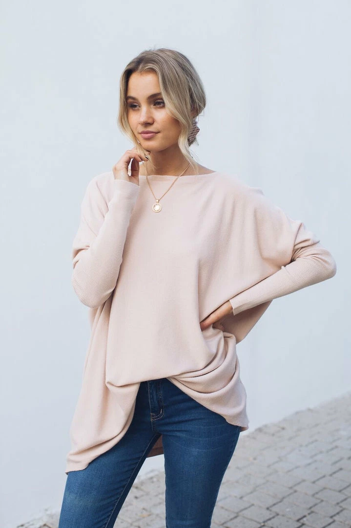 Our Tamia Knit is a gorgeous light blush-pink tone in an oversized drape fit. This top features boat neckline, batwing long fitted sleeves and a roomy fit making this ideal for growing baby bumps. Pair tucked into your fave denim and ankle boots for a cute off-duty look.