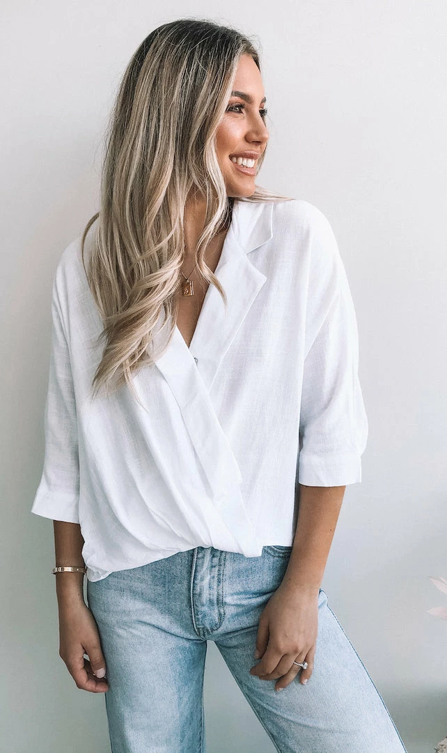 Our Plato Top is your next fave white shirt featuring a twist hemline with a structured collar & relaxed 3/4 sleeves. Pair with your fave denim & gold jewellery for an effortless outfit.