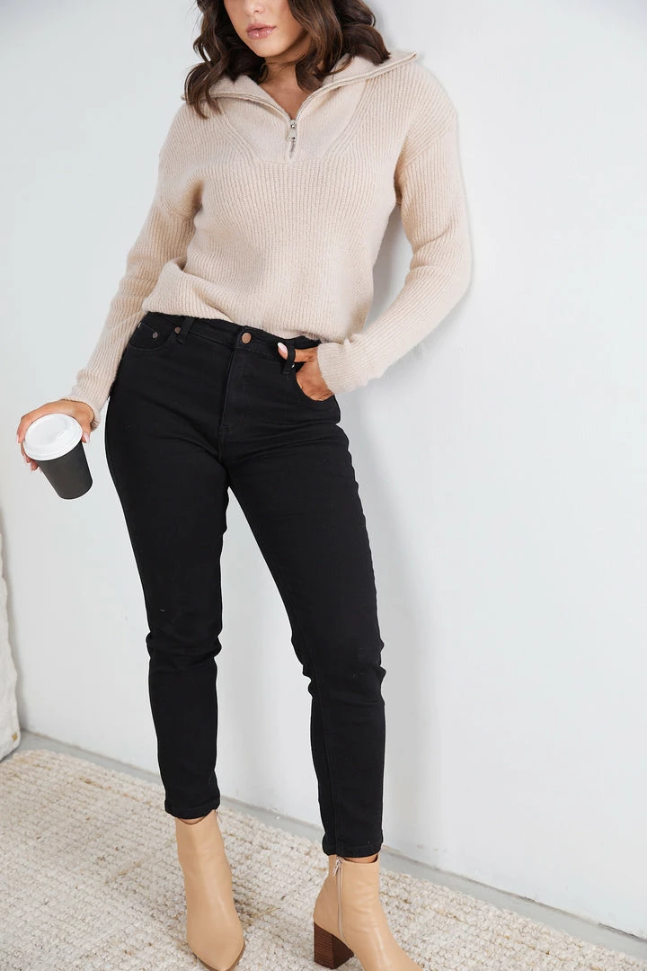 Our Majara Jeans come in a classy black tone denim. Made to accompany you in your busy errand day, these pants feature a straight leg fit, belt loops, button & zip closure, side pockets and ankle length hem. This classic piece goes great with a wide range of tops from basic to dressy!