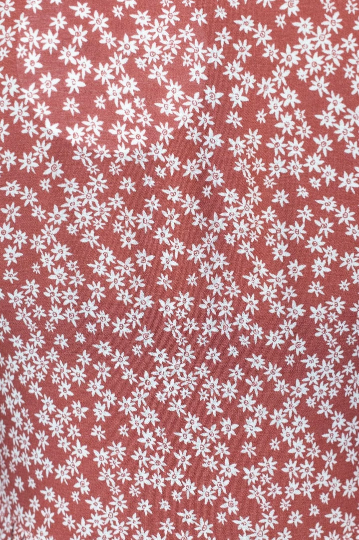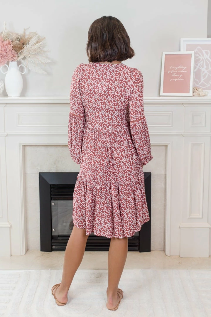 Our Capricia Dress comes in a deep red tone base, with a contrasting white floral print. It features a v neckline, long relaxed sleeves cinched at the cuff and a layered skirt. Pair this mini with your favourite pair of tan sandals for an effortless transseasonal look!
