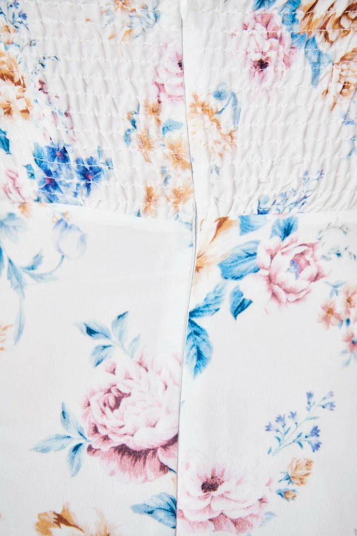 Our Cleo Dress is a white base with a floral print. This vibrant printed lightweight dress is sure to be your fav Spring occasion dress. This midi features a shirred elastic back for a comfortable fit whilst the sweetheart neckline is a feminine and gorgeous addition. The side split makes walking a breeze and the invisible zip at the back is an effortless feature of this lovely dress.